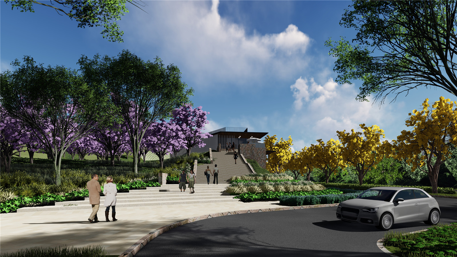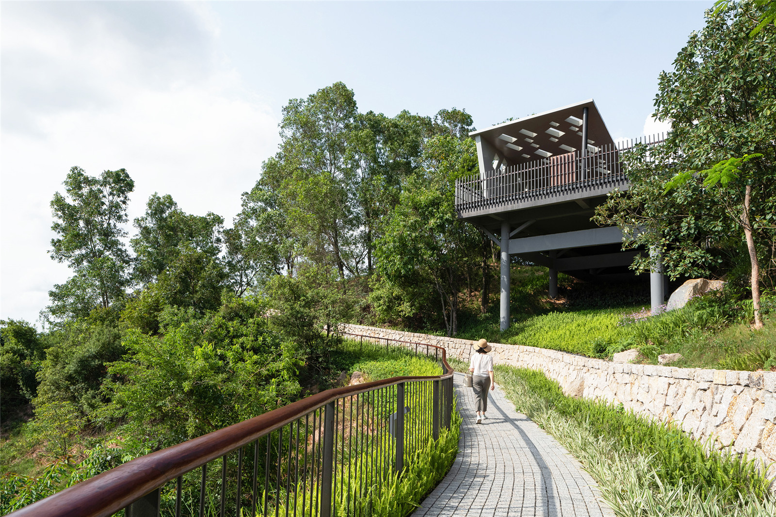 視覺(jué)層次豐富的主入口廣場(chǎng)與舒適的坡道和寬闊的臺(tái)階融合自然坡地,提升可達(dá)性,令公園游人能更能享受此山地生態(tài)公園的環(huán)境。