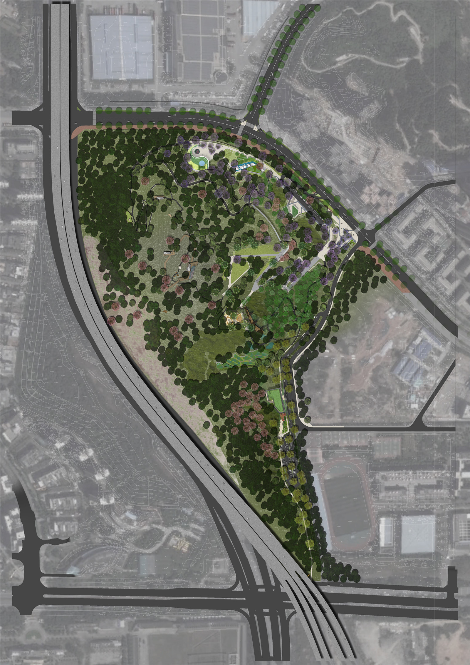 To allow better understanding of the site opportunities, the design team took the initiative to investigate the site and its environmental conditions. From the existing derelict landscape and loose patches of trees, the design team recognized an effective ecological restoration and implementation is needed to reaffirm the functional positioning of the city park as the green lungs; improve the ecological conditions of the site; and strengthen the connectivity of the eco-green in the area. At the same time, the opportunity is to take the mountainy landscape with 80-meter level differences to create a multi-levels/ multi-layers leisure landscape park experience. As the parkland is located in the future development area of the city core and is surrounded by high-quality densely developed residential and office communities, the park design shall meet the existing and future needs of the citizens in living, learning and social aspects.