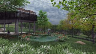 場(chǎng)地中利用地形起伏,以自然雨洪管理系統(tǒng)的策略,令流入公園中的雨水經(jīng)過(guò)地形引導(dǎo),匯入耕地以及自然植被區(qū)域。而局部區(qū)域營(yíng)造了一系列的下沉式綠地,可以實(shí)現(xiàn)季節(jié)性的雨水花園。人們可以走在雨水花園的一側(cè)近距離觀賞,也可以站在觀景平臺(tái)上俯視。