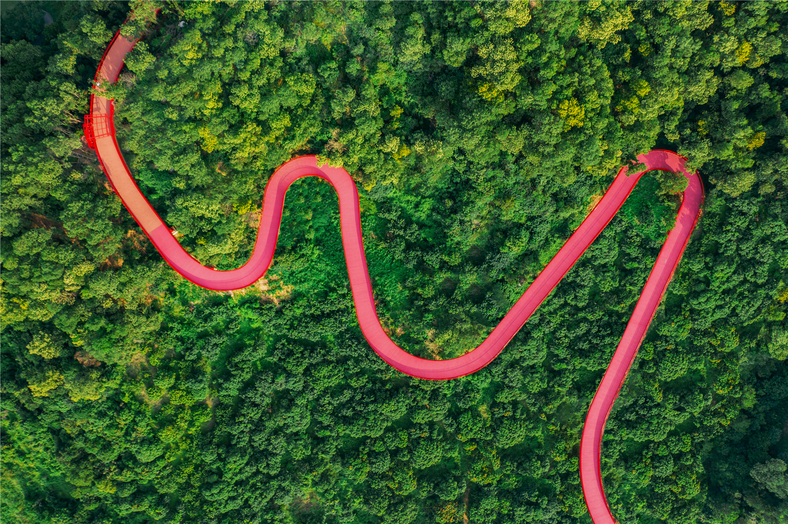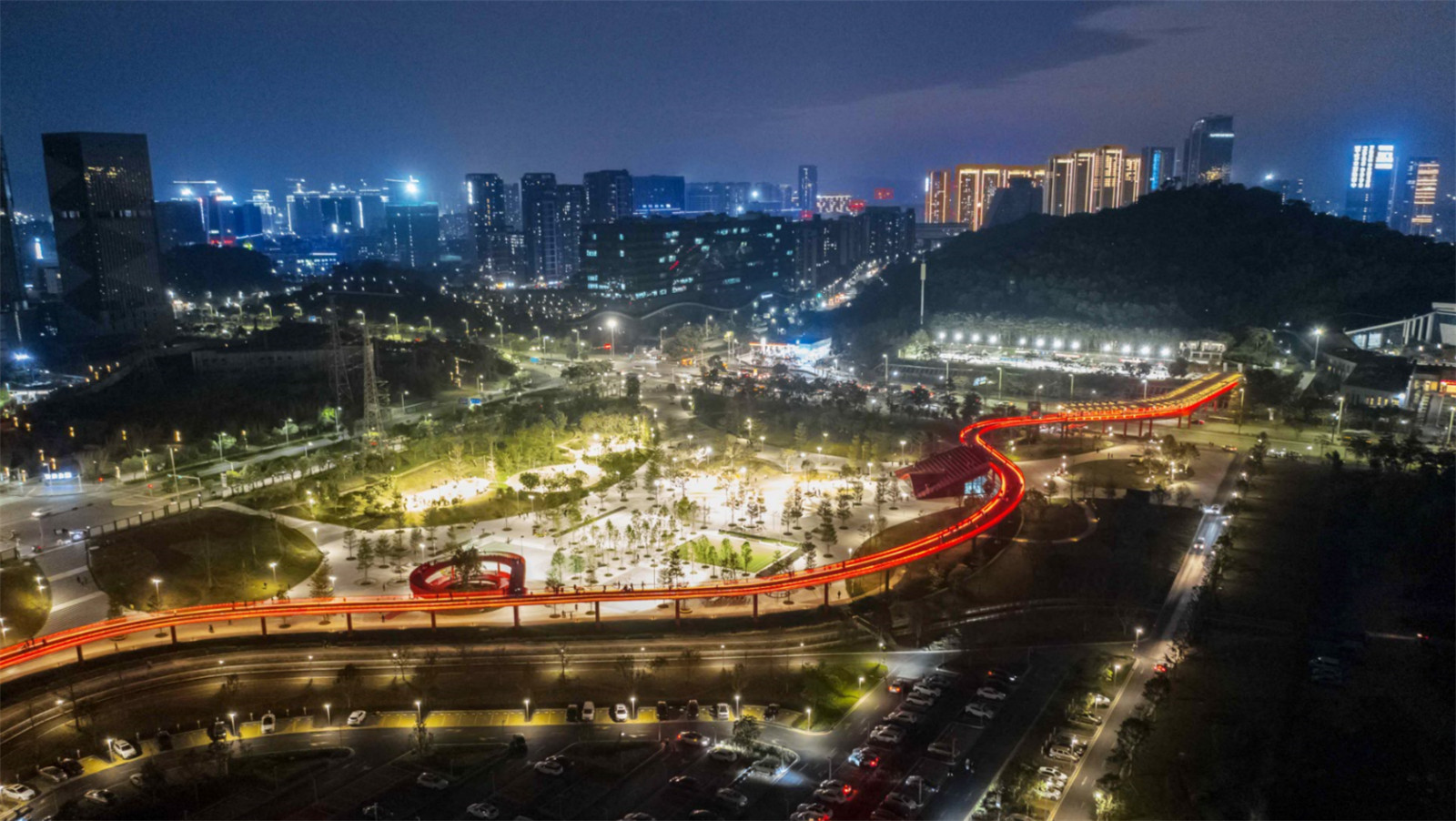 ▼從森林運動公園標志性的紅色步道遠眺城市