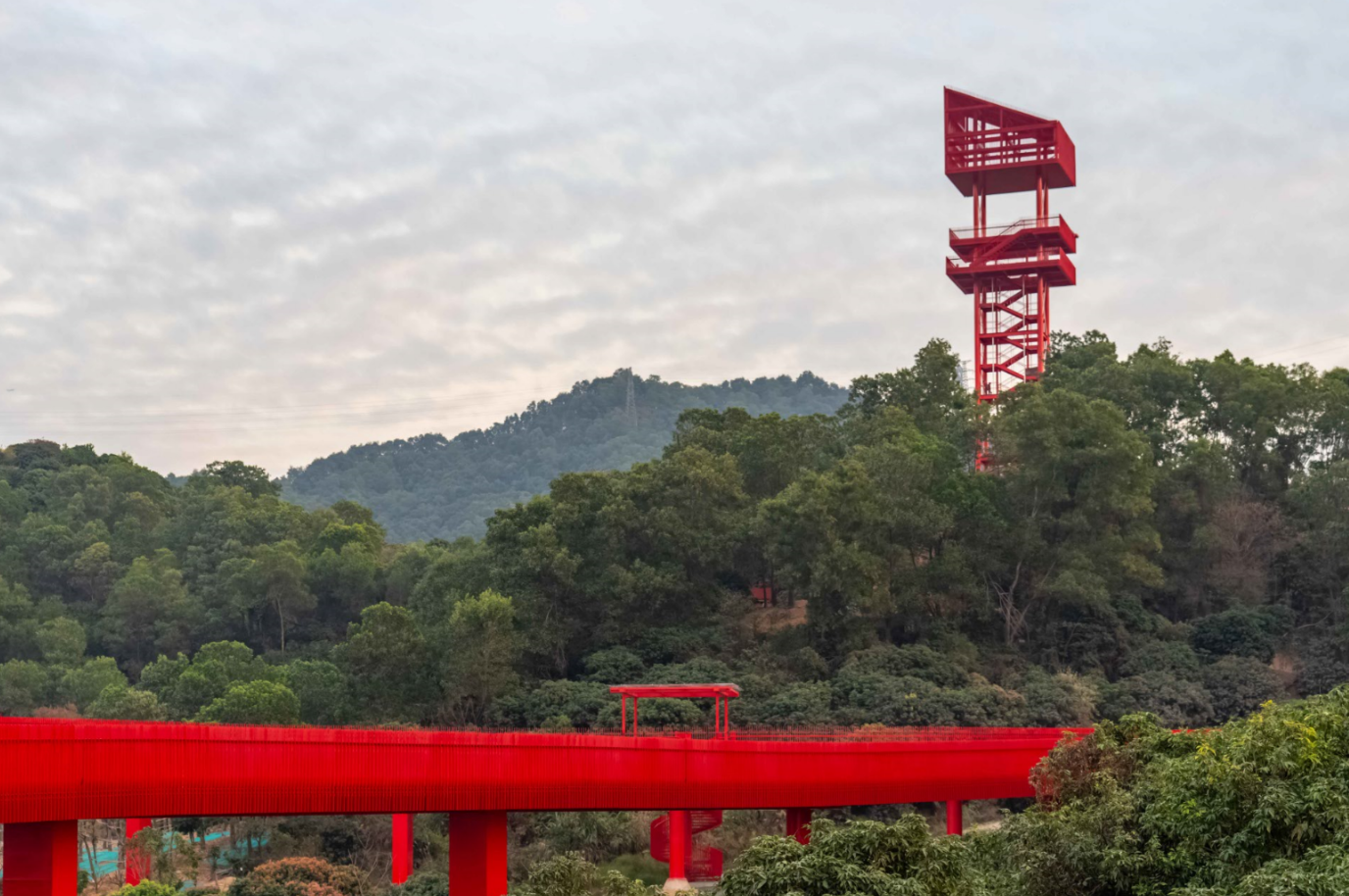 The Shenzhen area is all about innovation, therefor the ambition was to make a park that is as innovative as the city itself. A park that can adapt to the constant evolution of sports and were we can constantly contribute to a more resilient nature. An elevated red path gives universal access to the forest. With a steady soft slope, connecting ramps and elevators it provides users from all age groups a safe and easy way to visit the mountain. To enjoy the views of the surrounding city and the ability to immerse yourself in the thick forest. The Forest and Sports Park forms a slow transition space between the city of Guangming and the forest reserve.