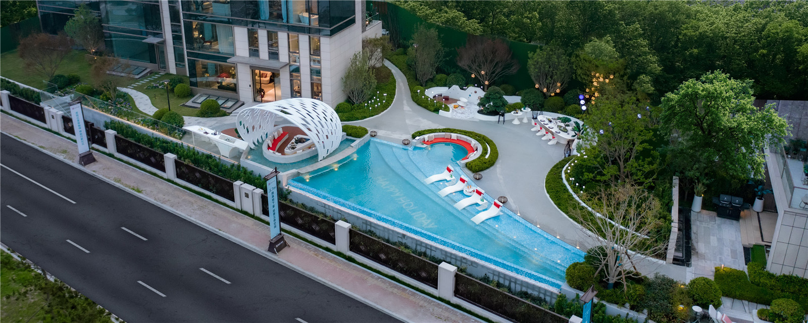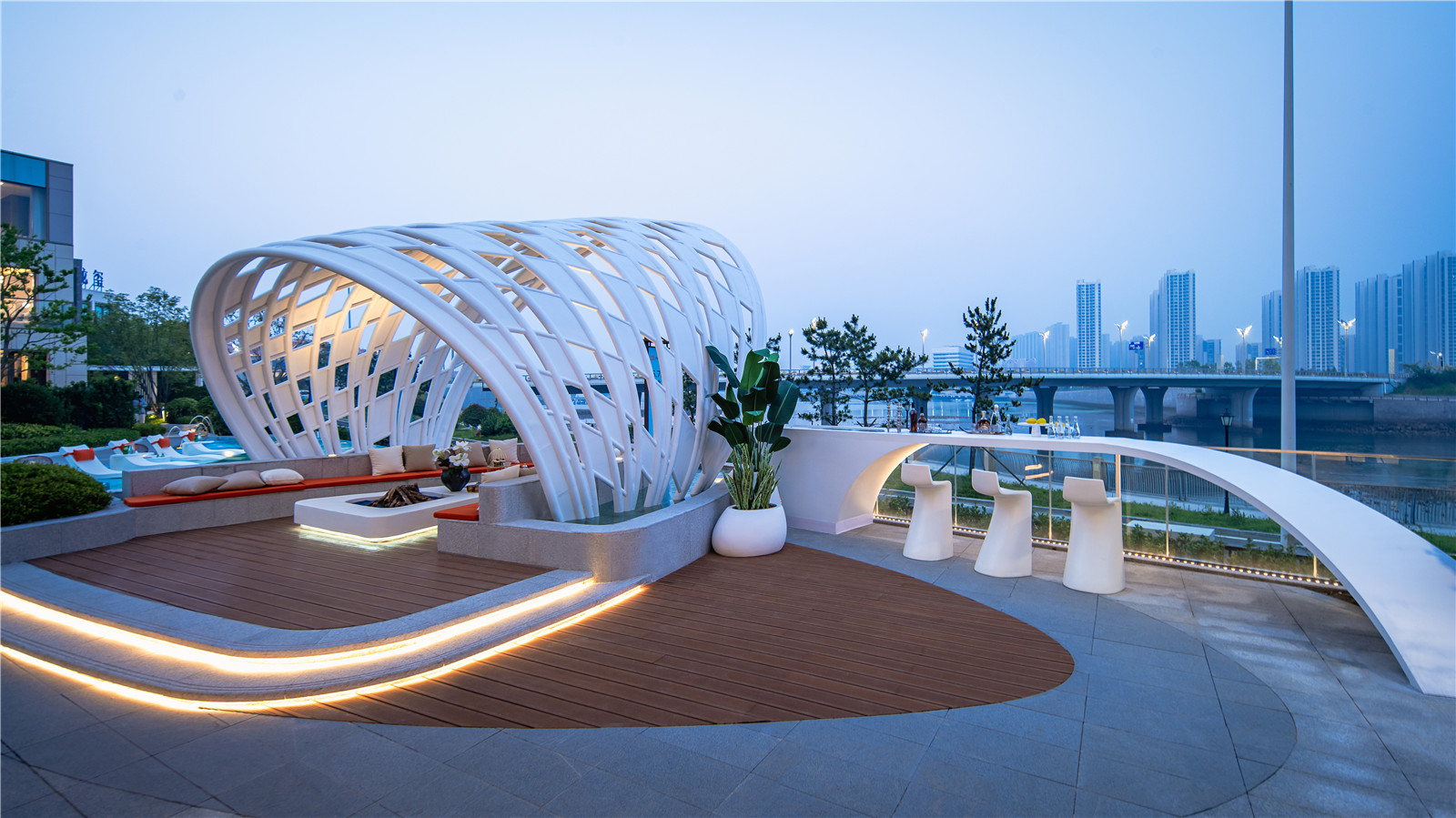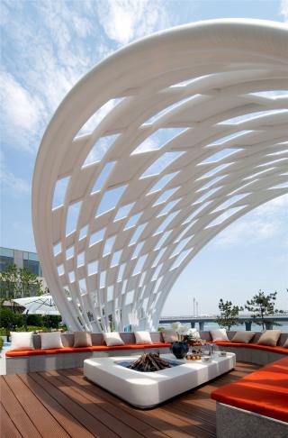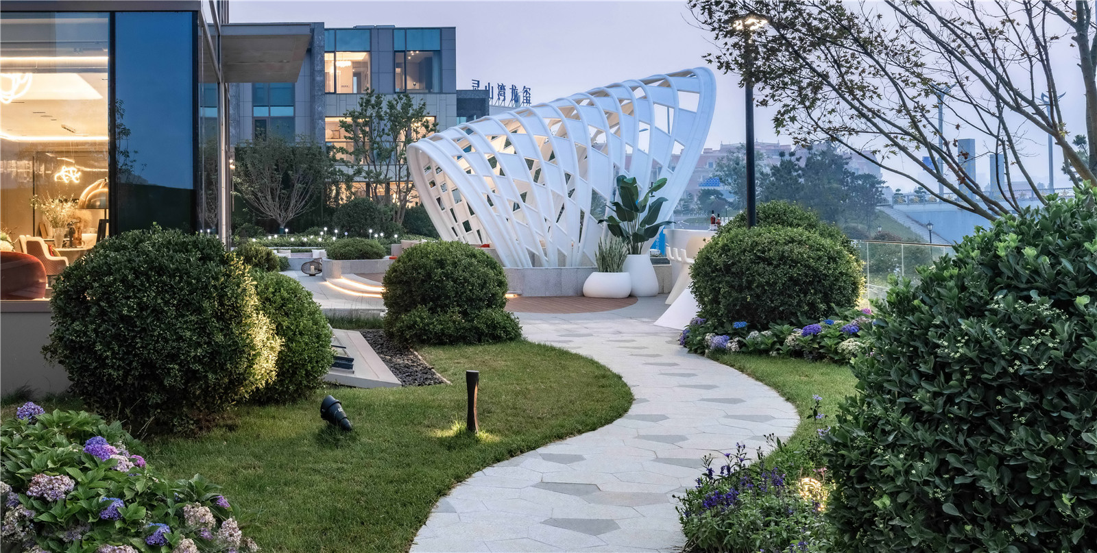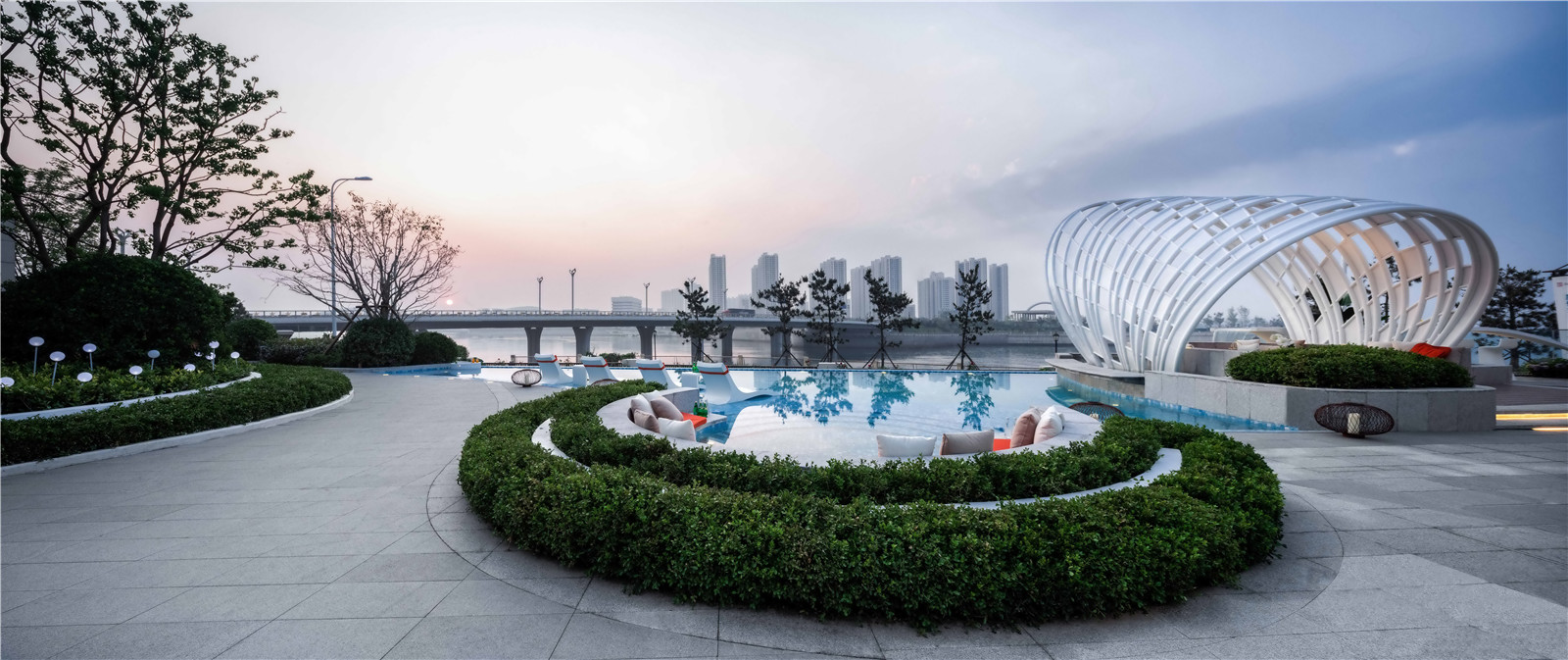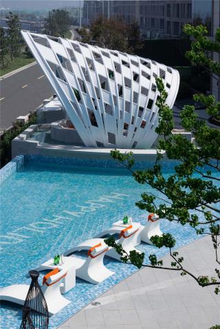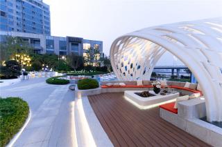 從青島的高端濱海度假資源和國(guó)際郵輪港的定位出發(fā),景觀設(shè)計(jì)以“家始于游輪假日”為主題線,提取游輪的功能結(jié)構(gòu)布局,融入云與海的韻律,結(jié)合度假主題場(chǎng)景,用自由靈動(dòng)的流線型空間界面串聯(lián)起各功能板塊,營(yíng)造出和緩舒適的高端專屬度假氣氛。