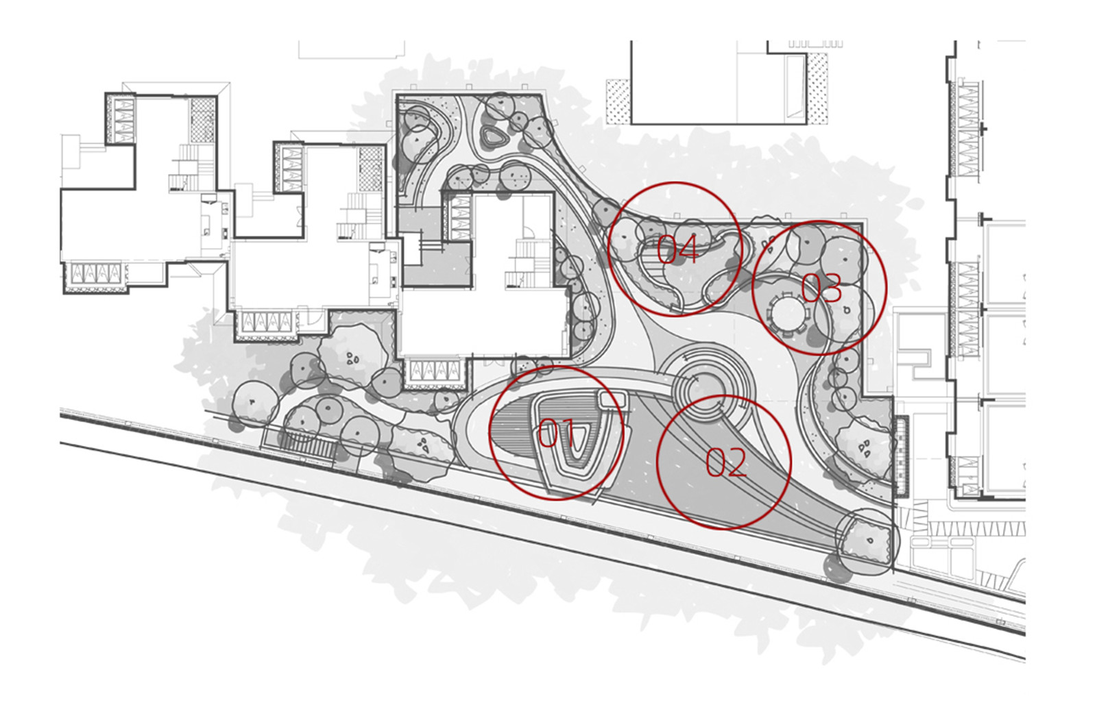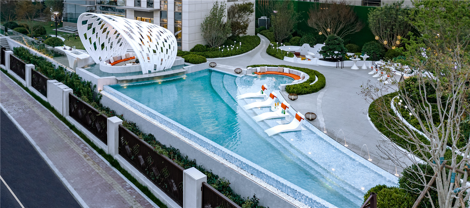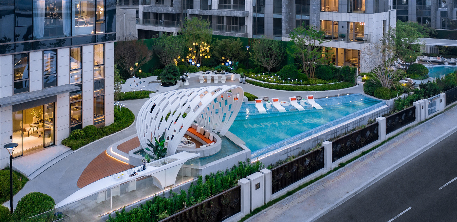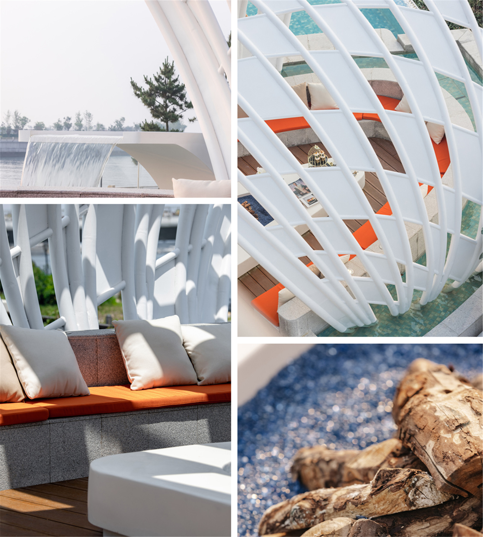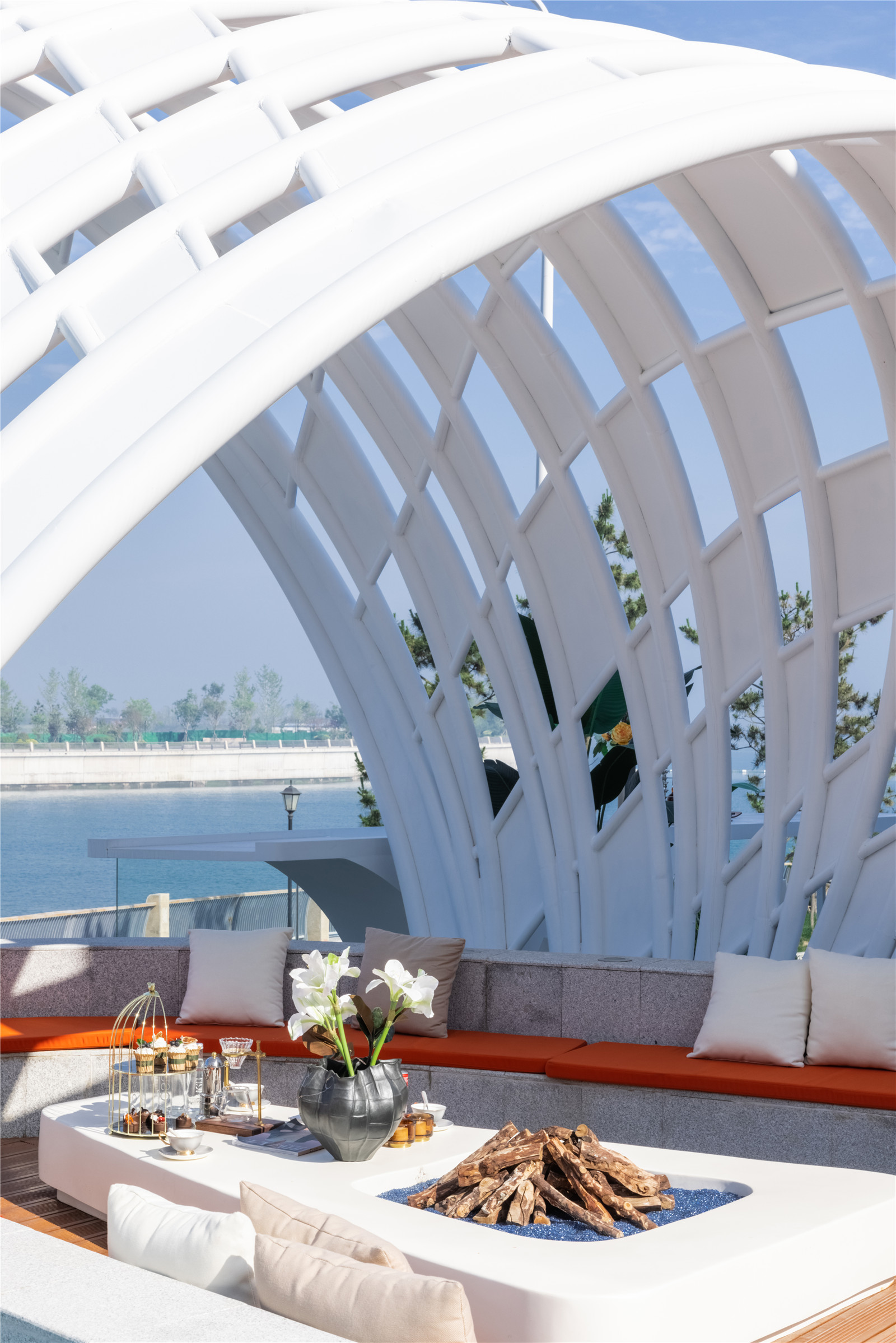 從青島的高端濱海度假資源和國(guó)際郵輪港的定位出發(fā),景觀設(shè)計(jì)以“家始于游輪假日”為主題線,提取游輪的功能結(jié)構(gòu)布局,融入云與海的韻律,結(jié)合度假主題場(chǎng)景,用自由靈動(dòng)的流線型空間界面串聯(lián)起各功能板塊,營(yíng)造出和緩舒適的高端專屬度假氣氛。