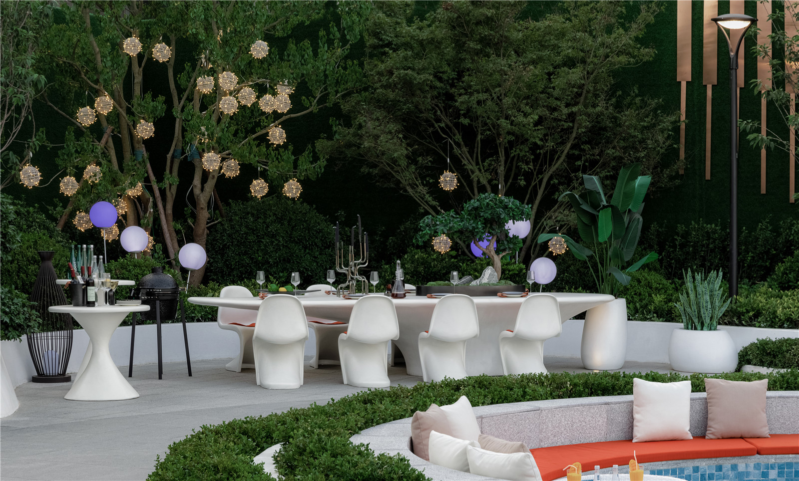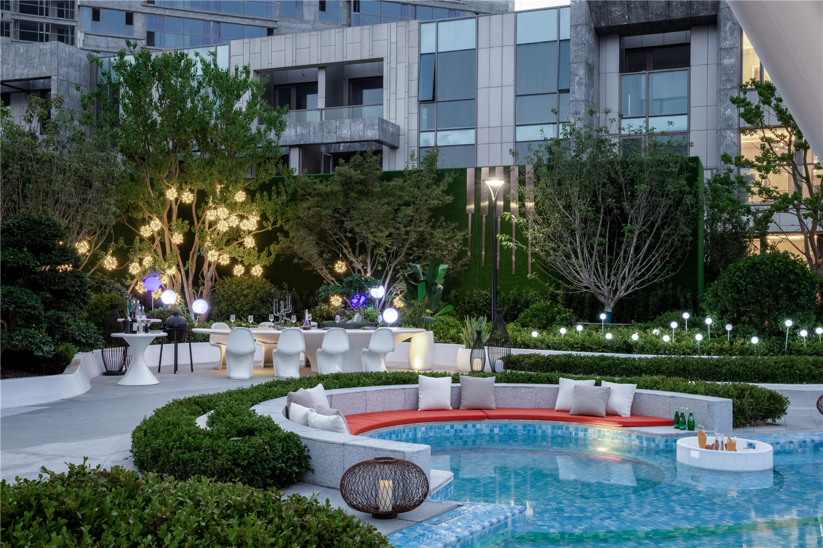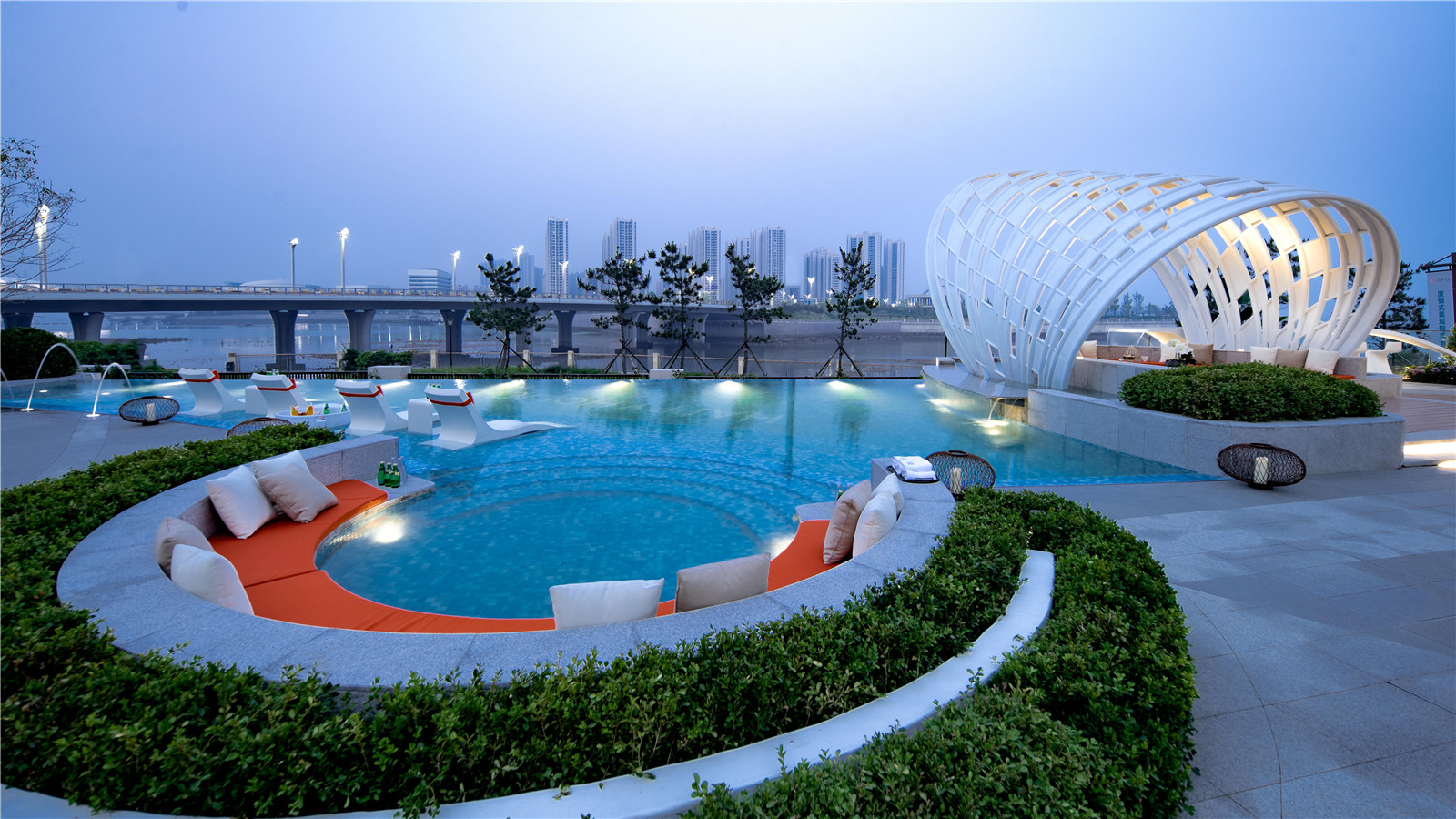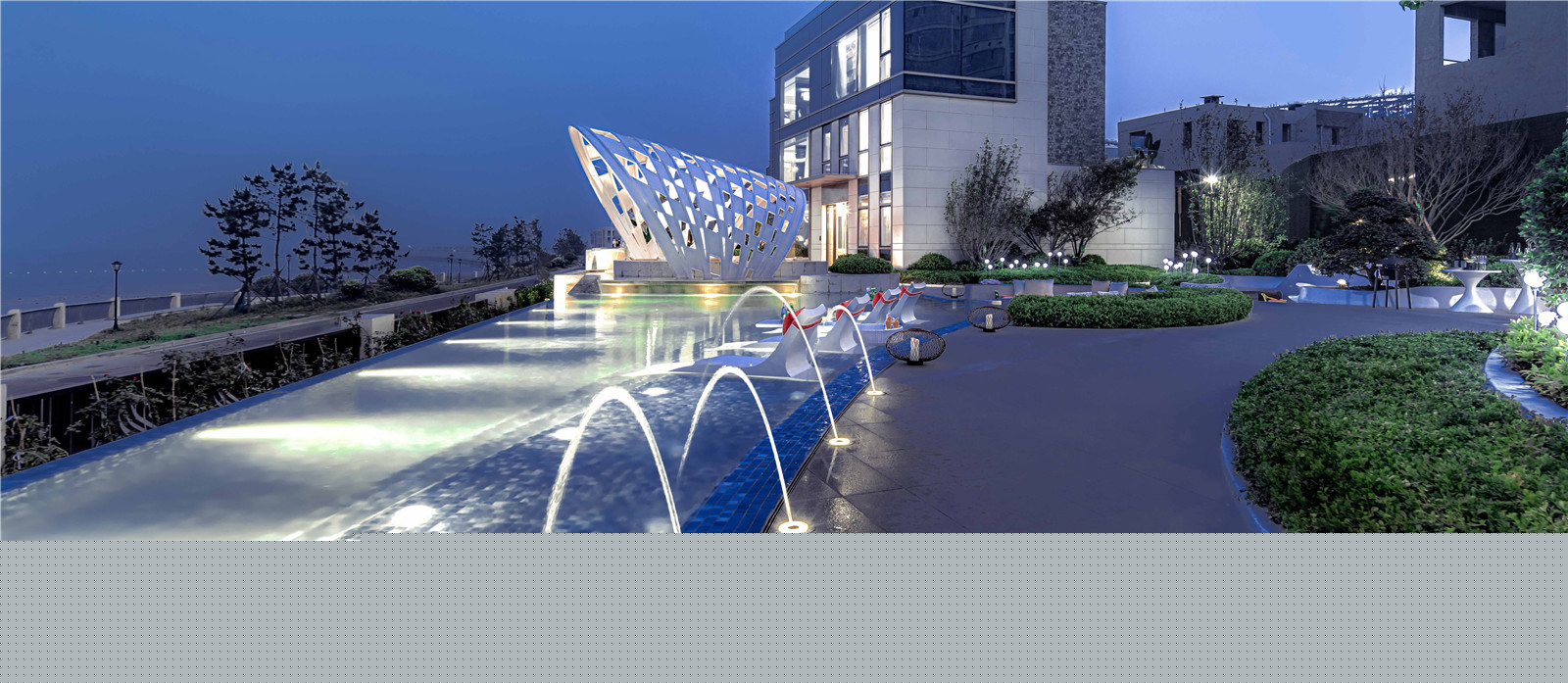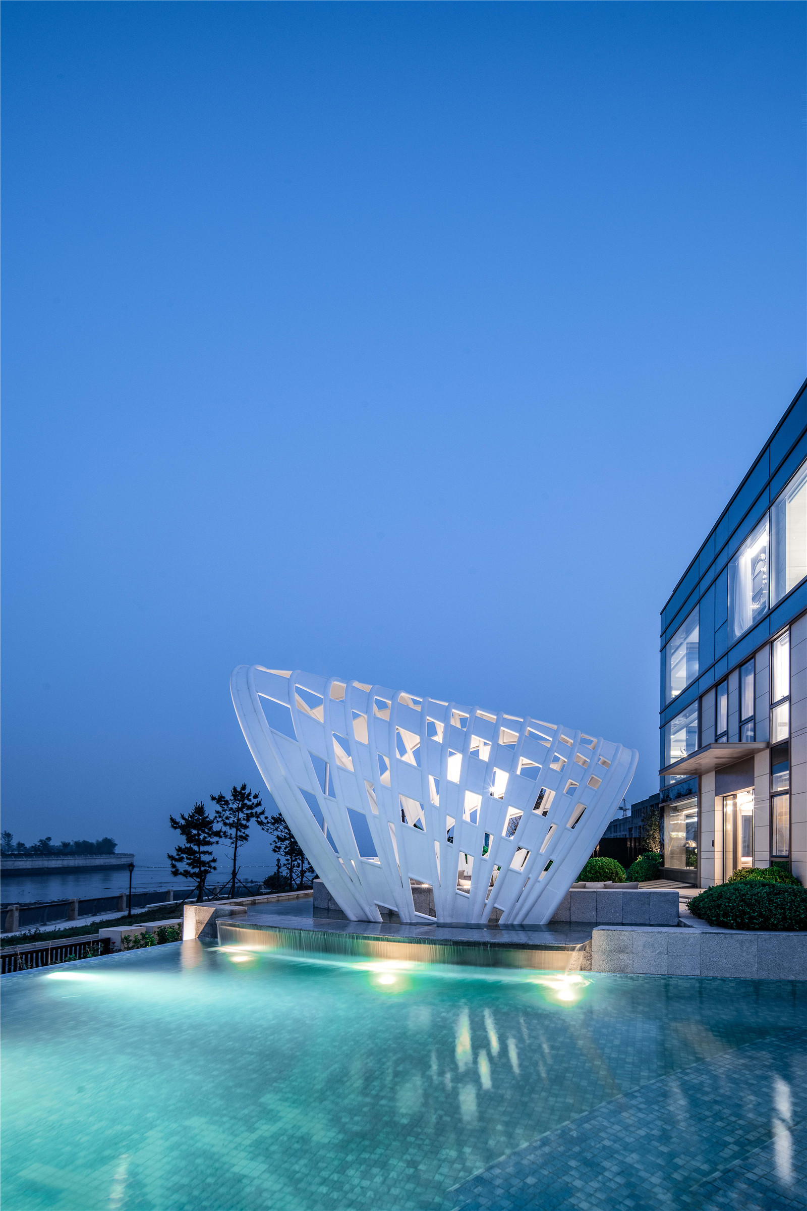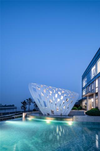 空間是藝術(shù)的呼吸透明玻璃圍合而成的無邊界泳池,遠(yuǎn)觀更像是和大海接壤的一個(gè)小海灣。夜幕之下池水與海天景色融為一體置身其中,仿佛浮游于天地間海之綠、池之碧、天之藍(lán)做了最巧妙完美的融合。