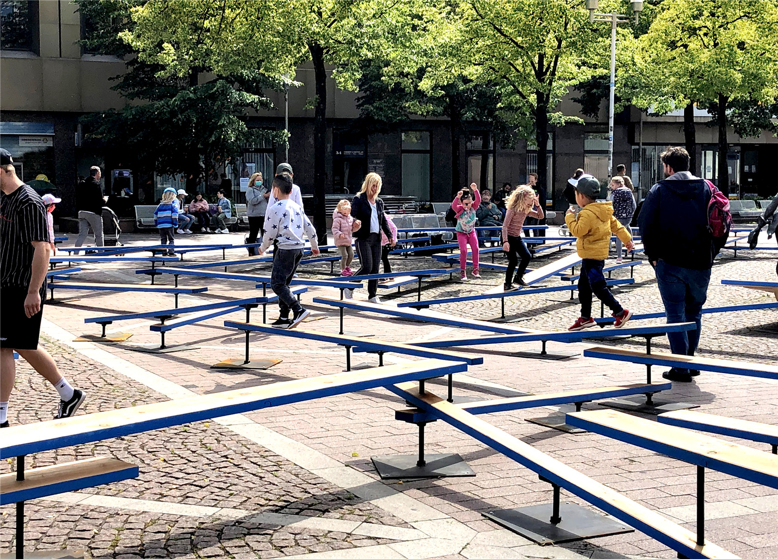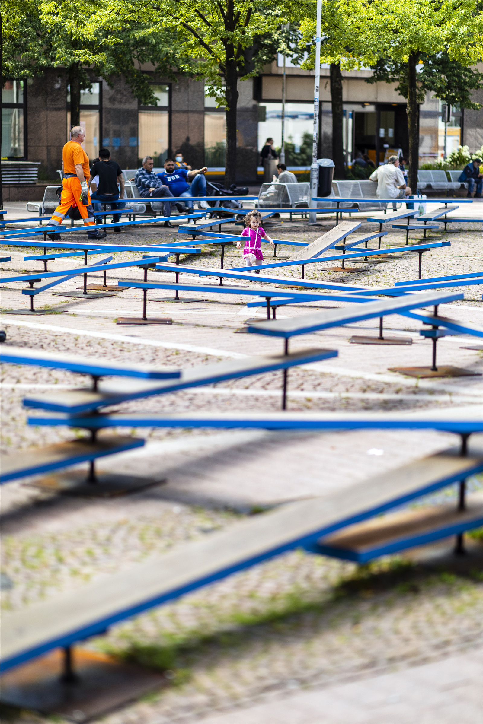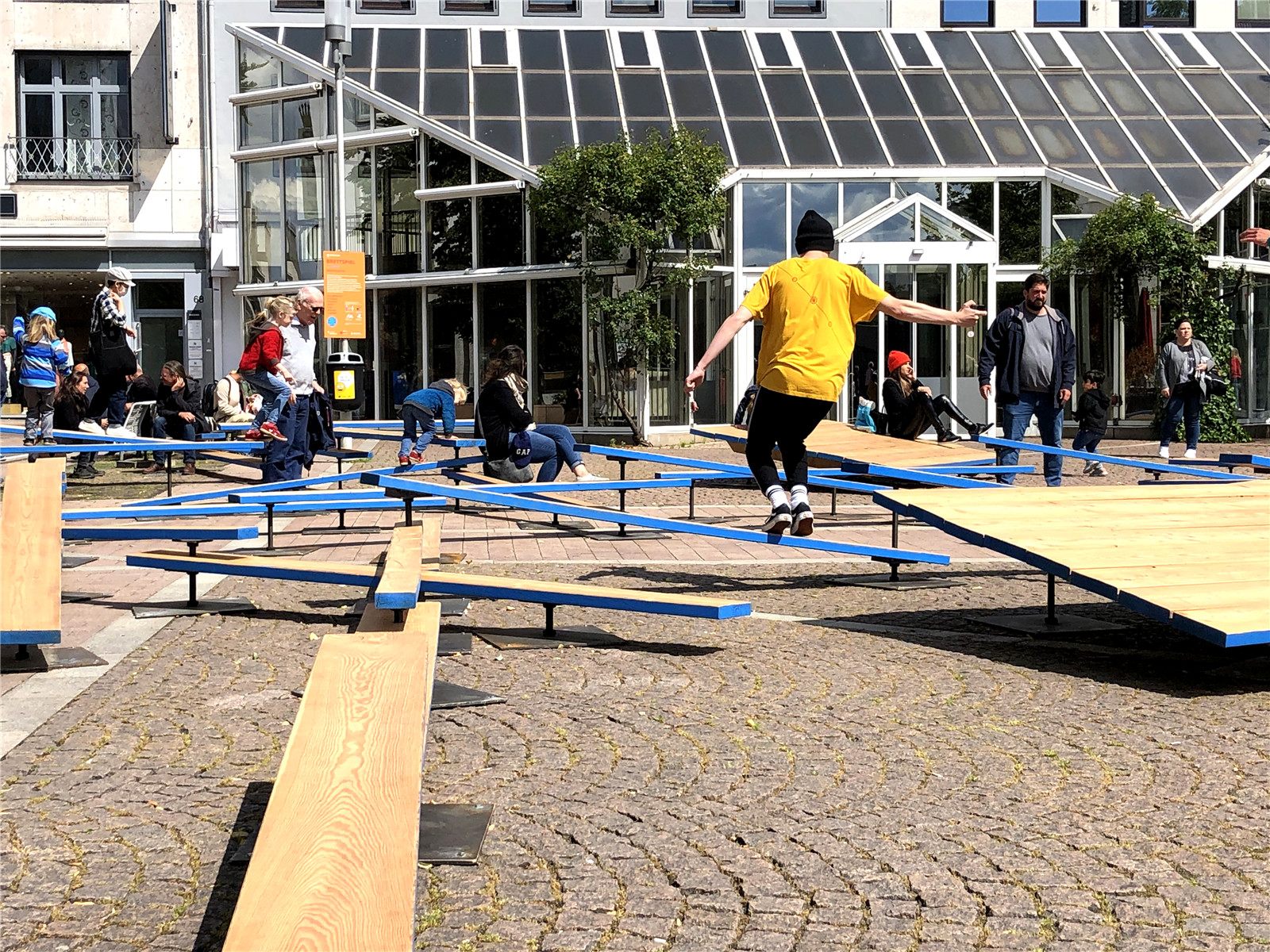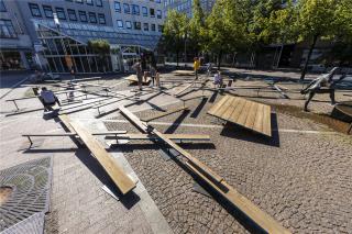 The starting point of the board game is to break the rigid symmetry of the square. The board game refuses idiosyncratic axiality and seeks tension in a form that brings a chaotic moment to the square. About 90 boards lay across the square like a network of narrow webs. The boards run horizontally, dip one below the other, are inclined or have gaps that have to be overcome.