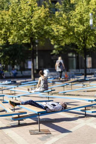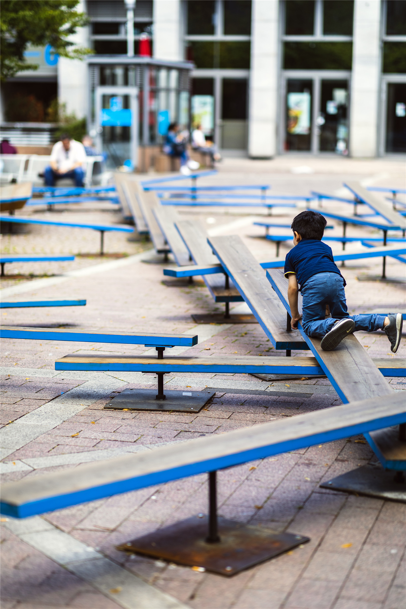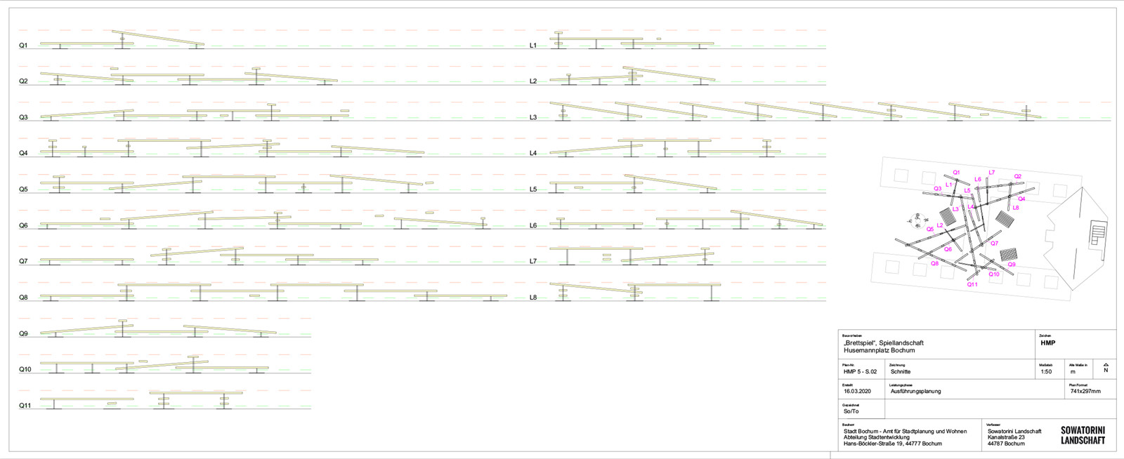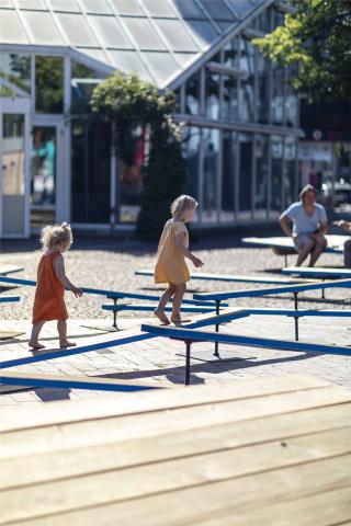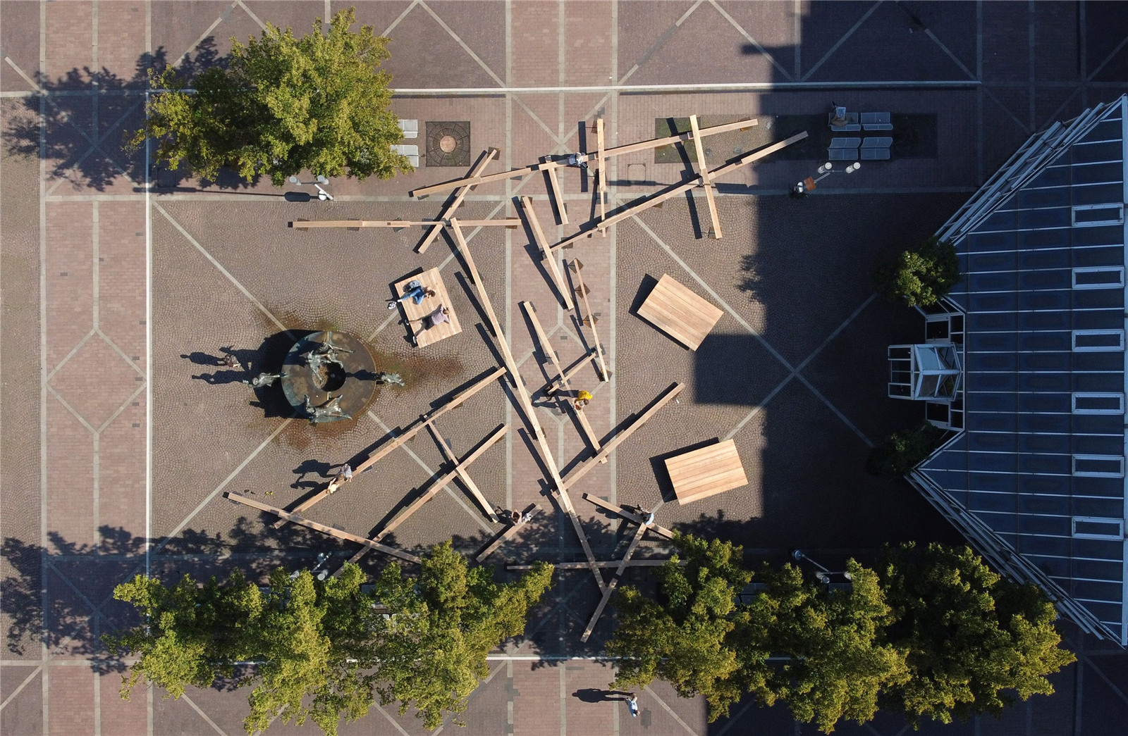 The starting point of the board game is to break the rigid symmetry of the square. The board game refuses idiosyncratic axiality and seeks tension in a form that brings a chaotic moment to the square. About 90 boards lay across the square like a network of narrow webs. The boards run horizontally, dip one below the other, are inclined or have gaps that have to be overcome.