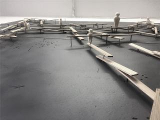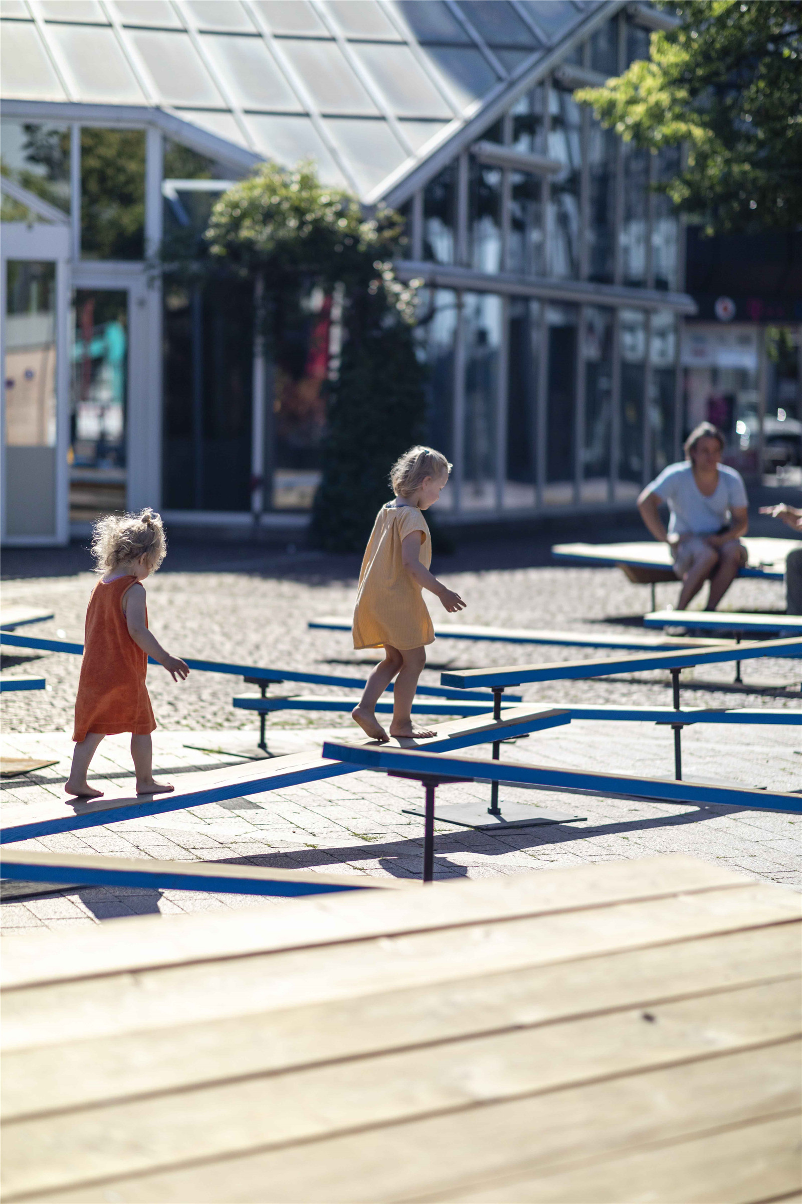 但是在混亂的背后,卻還是內(nèi)含邏輯的:每塊木板都是相同長度,并且相互連接成行。沒有任意一塊是單獨(dú)存在的,它們始終都至少和另外一塊木板連成線。這樣有意為之的混亂使得場地有一種富有創(chuàng)造性的平衡,而設(shè)計(jì)整體還是清晰可辨的。對我們來說,這不僅是一個(gè)游戲場地,更是一個(gè)對所有人開放的、暫時(shí)的、雕塑性的景觀。這件作品的外觀也凸顯了其臨時(shí)性和實(shí)驗(yàn)性。