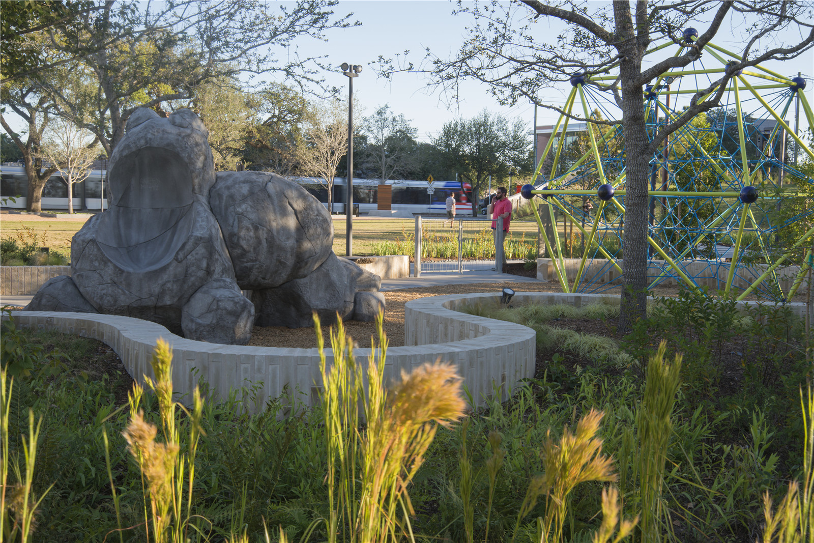 The backbone of the site and key feature of the design was the integration of the “Bayou”, a constructed water channel and detention system, which mimics the natural bayous, swamps, bottomland hardwood forests and wetlands of Houston, all of which are integral pieces of the hydrology of the region. This system has proven to enhance economic and ecological resiliency by protecting against flooding while improving water quality and wildlife habitat for amphibians, insects and birds. During the recent extreme rainfall that occurred during Hurricane Harvey in August 2017, the Bayou was able to absorb and detain all the water that the site received, preventing local flooding and damage to the park.