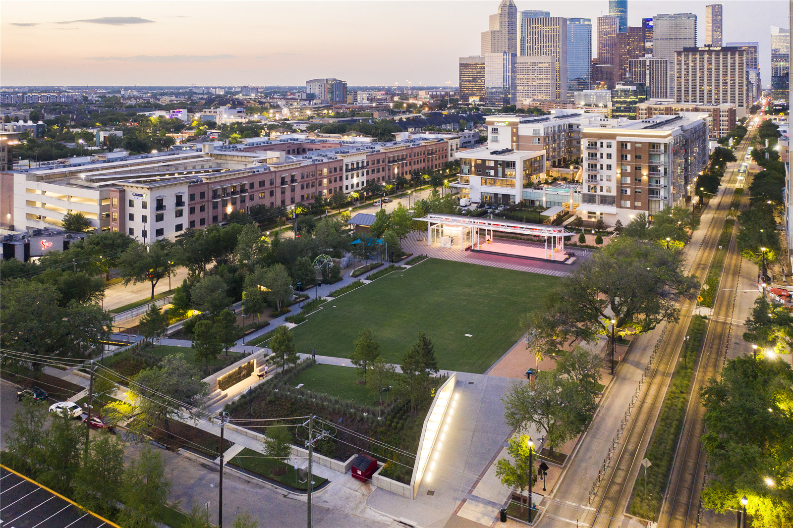 中城區(qū)坐落在休斯頓市中心和醫(yī)療中心之間,毗鄰大量就業(yè)崗位,隨著城市的更新和開發(fā)而重獲新生。區(qū)域的繁榮增加了居民對公園的需求,同時也為全年的活動提供場地。中城公園的建設(shè)實現(xiàn)了中城重建局(MRA)20年前的規(guī)劃愿景,即在德克薩斯州休斯頓中城地區(qū)建造一個頂級公園。通過收購城市中心的廢棄場地以及大量規(guī)劃,中城重建局和當(dāng)?shù)亻_發(fā)商獲得了中城區(qū)最大的街區(qū)之一作為建設(shè)用地,占地達6英畝,并可直接欣賞休斯頓市中心的景色。通過這種合作開發(fā)模式,該場地擁有了充滿活力的城市公園以及多戶住宅區(qū),不僅方便了中城區(qū)的居民和商鋪,也有利于形成更大的社區(qū)。
