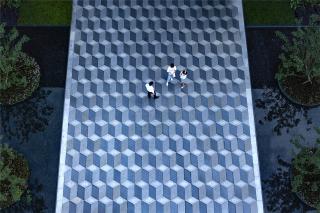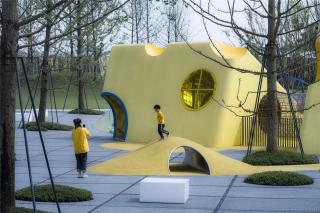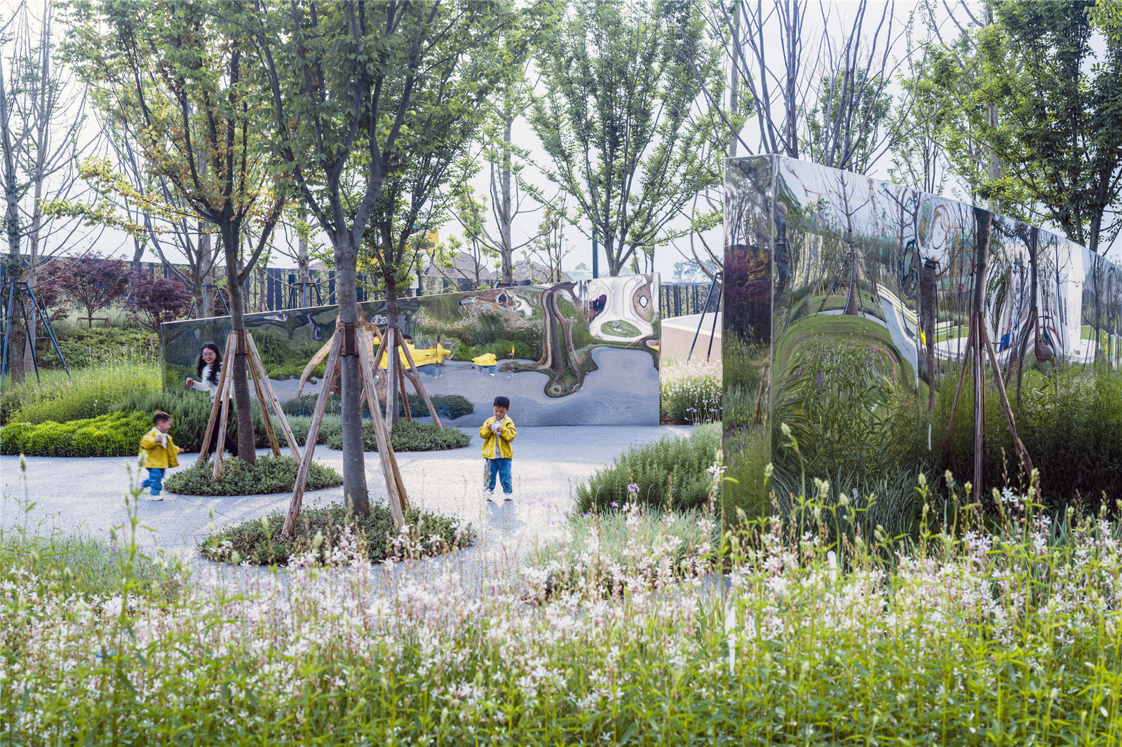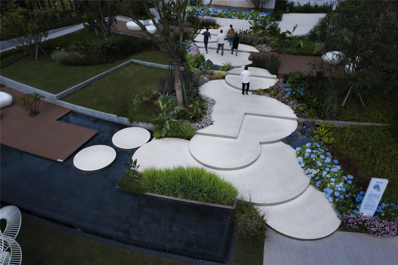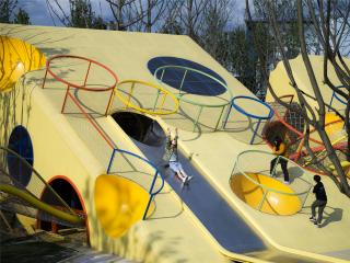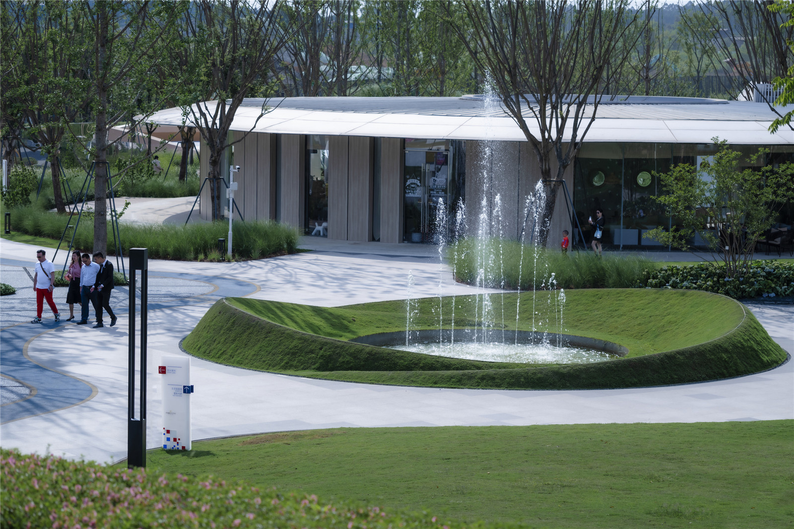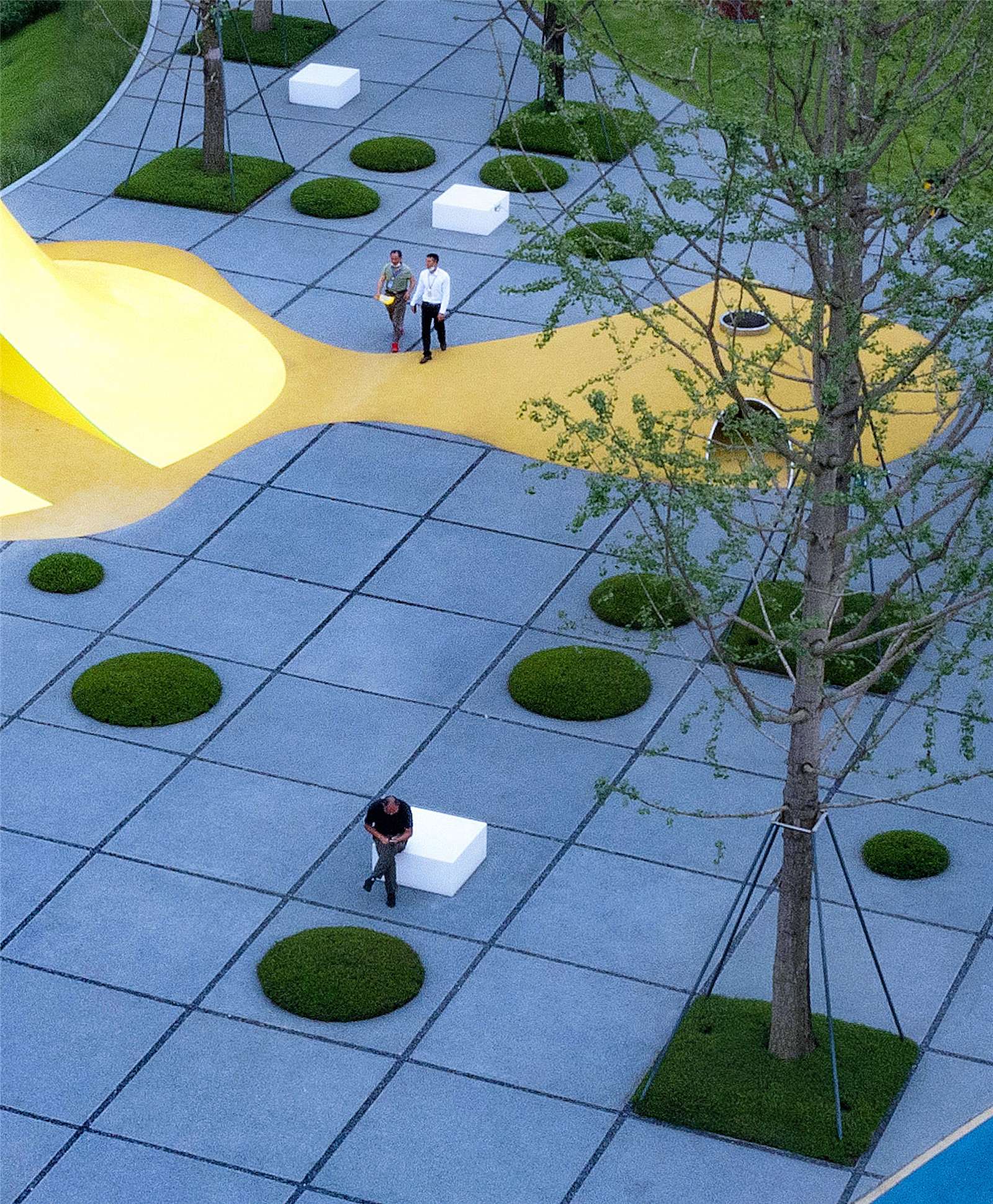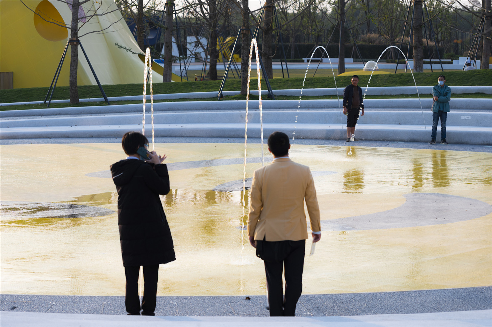 園區(qū)內(nèi)有兩座親子活動場地,笑臉嬉水劇場由淺水戲水空間與互動噴泉組成,是清涼夏日的打卡勝地;奶酪游樂場是一座近3000平米的下凹兒童活動場地,內(nèi)含多種無動力游樂設施,是親子玩樂的不二之選。公園有兩處大草坪,面積可容納幾千人,除舉辦大型商演活動、音樂節(jié)等大型事件性活動外,也是公園的社交中心。園區(qū)中心位置是藍花楹主題咖啡廳,通過這個環(huán)形建筑,為人們提供充足的休息和就餐空間,同時融合了360度的公園視線。環(huán)繞公園設有800米彩色健步道,休息座椅、休閑看臺遍布整個園區(qū),強調人性化體驗設計。生態(tài)方面作為相較周邊地塊地勢低洼的公園場地,設計通過高綠化面積、透水鋪裝與地下儲水裝置實現(xiàn)了合理排水與雨水地表徑流吸收再利用,減少了地下綜合管網(wǎng)的固有投入。