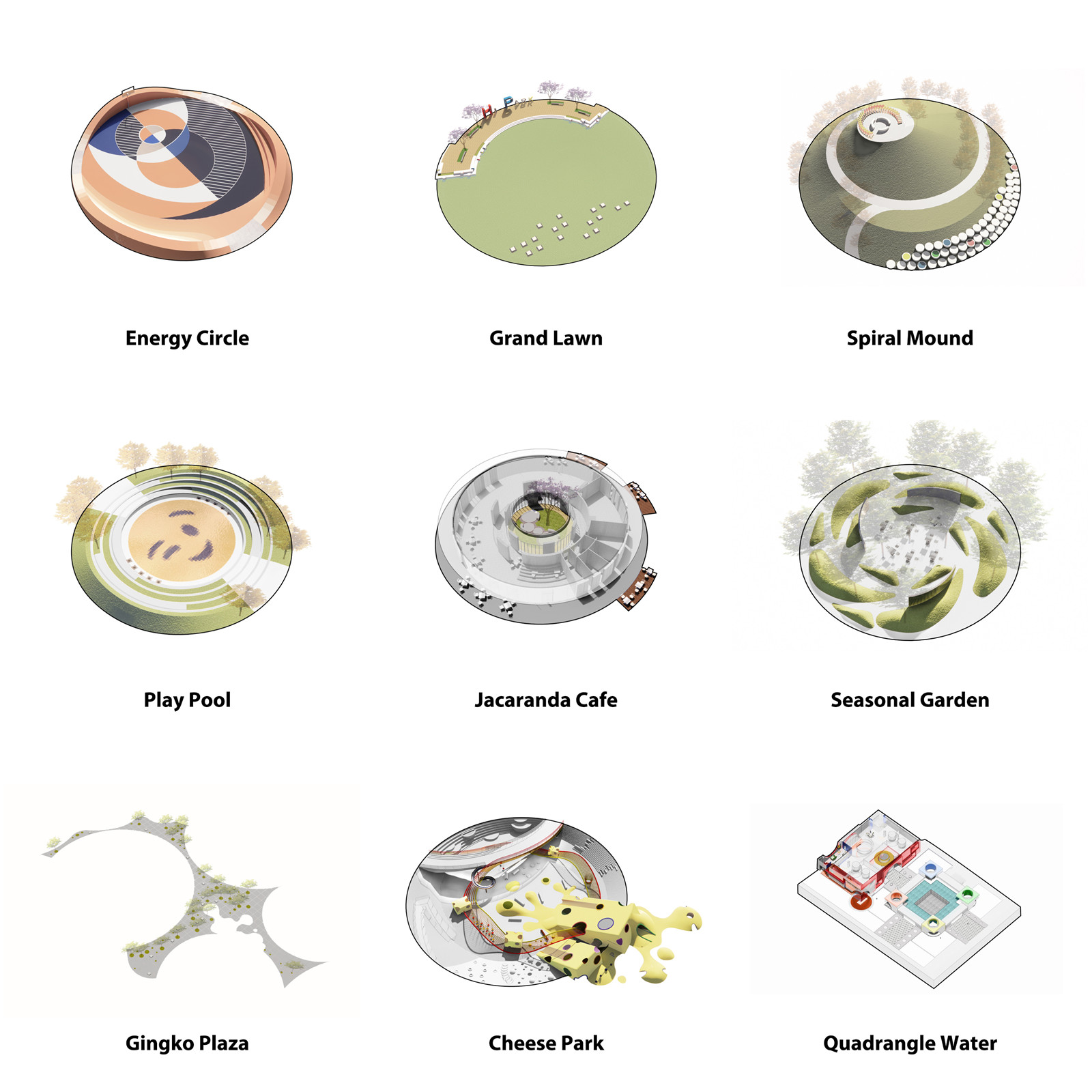 公園的設計圍繞著趣味體驗,人文社交和生態(tài)可持續(xù)的三大要素,將多種活動場地融入進尺度各異的圓形空間里,形成公園的整體框架,強調公園與人的強參與性,自然的強滲透性,及與城市的強銜接性。設計語言提取樂高自由多變的精髓,塑造了一個簡約,活力,彈性可變,肩負城市生態(tài)責任的未來公園。