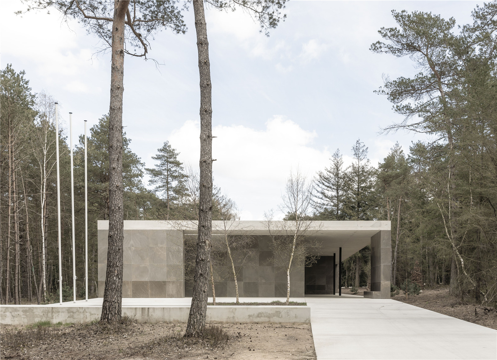 雖然設(shè)計(jì)語(yǔ)言與現(xiàn)有的公墓不同,但一些特征在新的設(shè)計(jì)中依舊得到了體現(xiàn)。例如,開放空間和封閉空間的對(duì)比,明與暗的對(duì)比,簡(jiǎn)約適度的內(nèi)部裝飾,白色的使用,以及與森林形成明顯對(duì)比的建筑元素。公園般的墓室是可以安撫親屬的靜謐空間,為訪客創(chuàng)造了美麗的背景。紀(jì)念館和教育中心位于星形空間的軸線上,面向十字架。它構(gòu)成了荷蘭戰(zhàn)爭(zhēng)墳?zāi)够饡?huì)和Loenen國(guó)家退伍軍人公墓之間的連接通道。該建筑與周圍的景觀有著獨(dú)特的空間關(guān)系,具有極佳的視野和從外到內(nèi)、層次清晰的過(guò)渡。