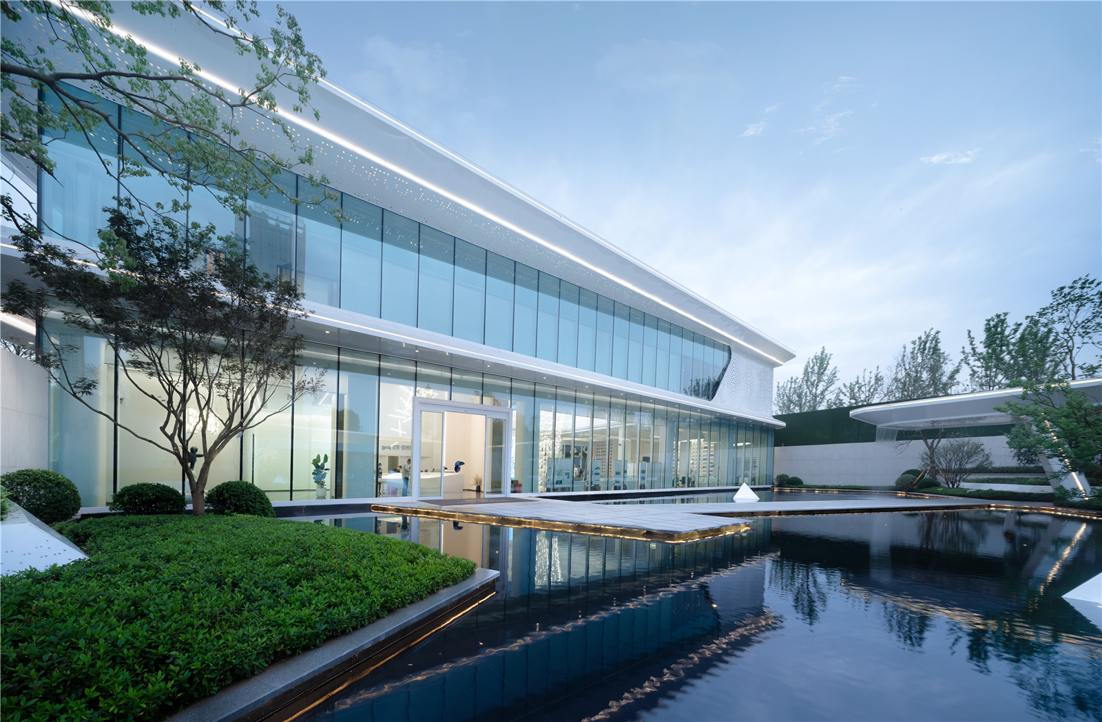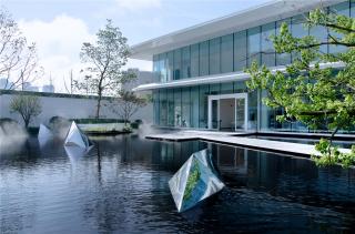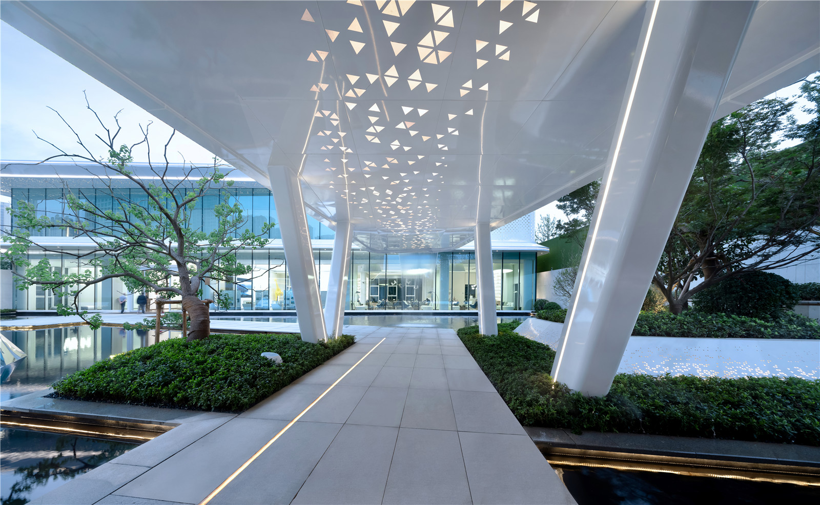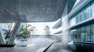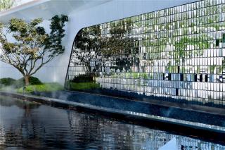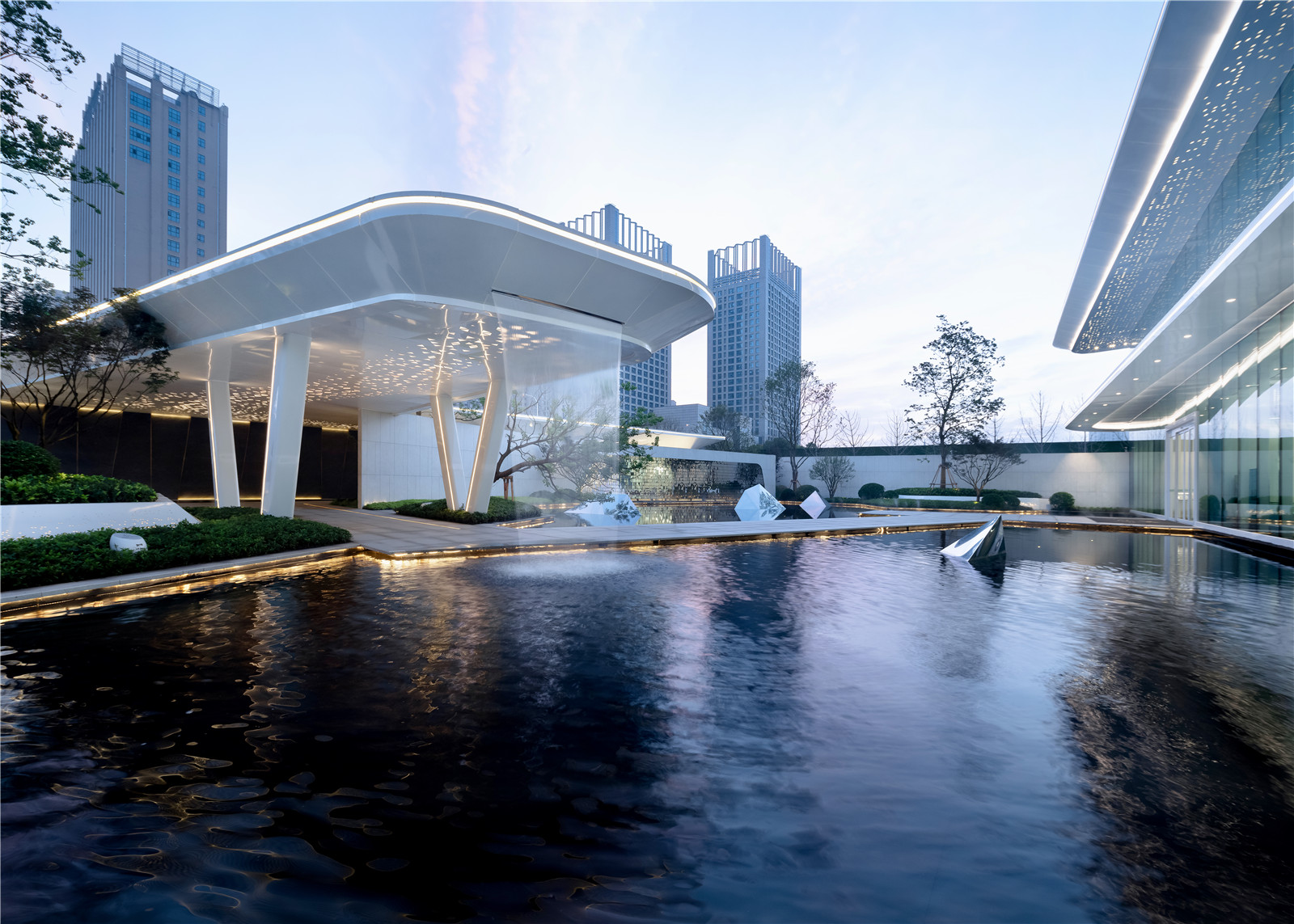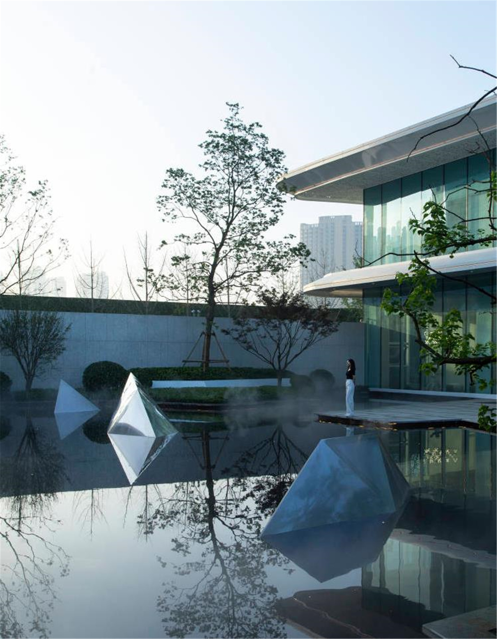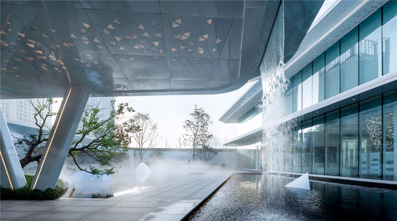 景觀風(fēng)動(dòng)幕墻,隨風(fēng)舞動(dòng),輕盈自然,與跌水珠簾、水鏡玉璞相映成趣,此處設(shè)計(jì)通過現(xiàn)代材質(zhì)與藝術(shù)美學(xué),碰撞出新的意境,一陣微風(fēng)拂過,波光粼粼,云霧飄渺間,云夢(mèng)澤的詩(shī)意景象御風(fēng)而至,墜落到水韻中庭,和著樹影,伴著船型雕塑,撥動(dòng)觀者的心弦,合奏成一幕“清風(fēng)明月本無(wú)價(jià),高山流水自有情”的云夢(mèng)詩(shī)篇,扶搖萬(wàn)象。