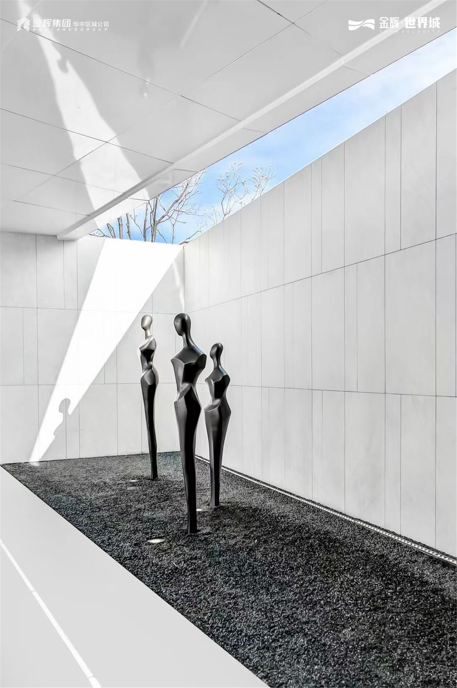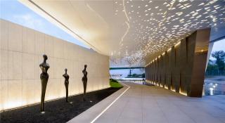 提取江城歷史長(zhǎng)河中的人文光輝為燈飾靈感,鏤空點(diǎn)綴,繁星點(diǎn)點(diǎn),璀璨生輝,在城市的角落中找尋自然與人文共生的力量。人形雕塑呈迎賓禮遇之姿,增加入口儀式,盡顯歸家的禮序尊崇之感,秩序與人文,層次與意蘊(yùn),隔而不斷,尋林行秘境,窺谷意長(zhǎng)留,萬(wàn)籟皆沉寂,唯聞金輝簌。