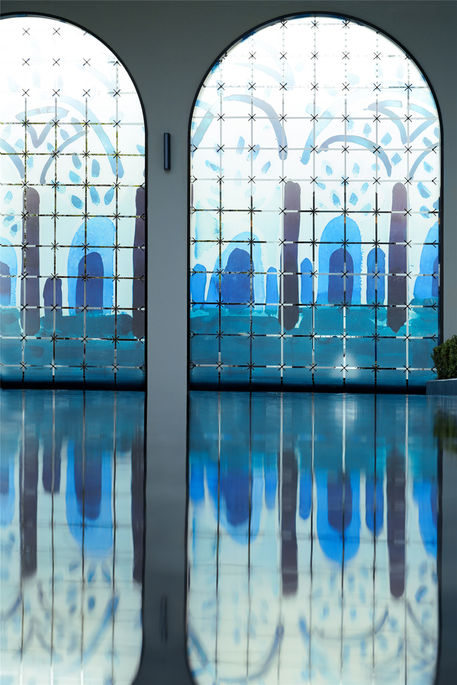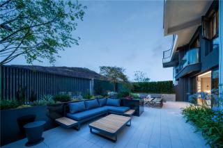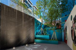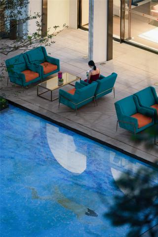 為對(duì)英國(guó)在世畫家致以最崇高的敬意,我們?cè)谒犊蛷d還原了霍克尼家中的設(shè)計(jì)《帶有藍(lán)色露臺(tái)的花園》中的用色格調(diào),顏色絢爛而沉靜,氛圍富含前衛(wèi)與野性,是藝術(shù)在天地之間的凝鑄。