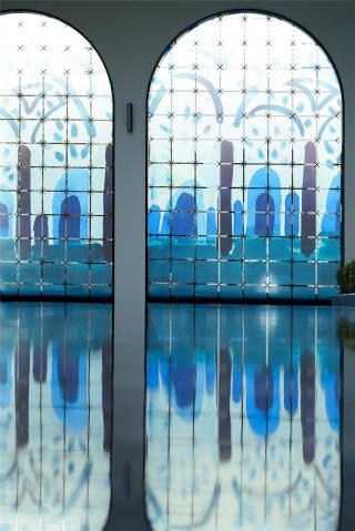 答案是在極具生命力的“兩千克藍(lán)”中,在色幕幻夢(mèng)的樓梯面墻之上,在一粒沙中窺世界,在一朵花中賞天國(guó)。隨著光影變幻,幾何與色彩在陽(yáng)光下彼此馴服,隨著觀者踱步而上,移步異景,迸發(fā)出淡淡的詩(shī)意。