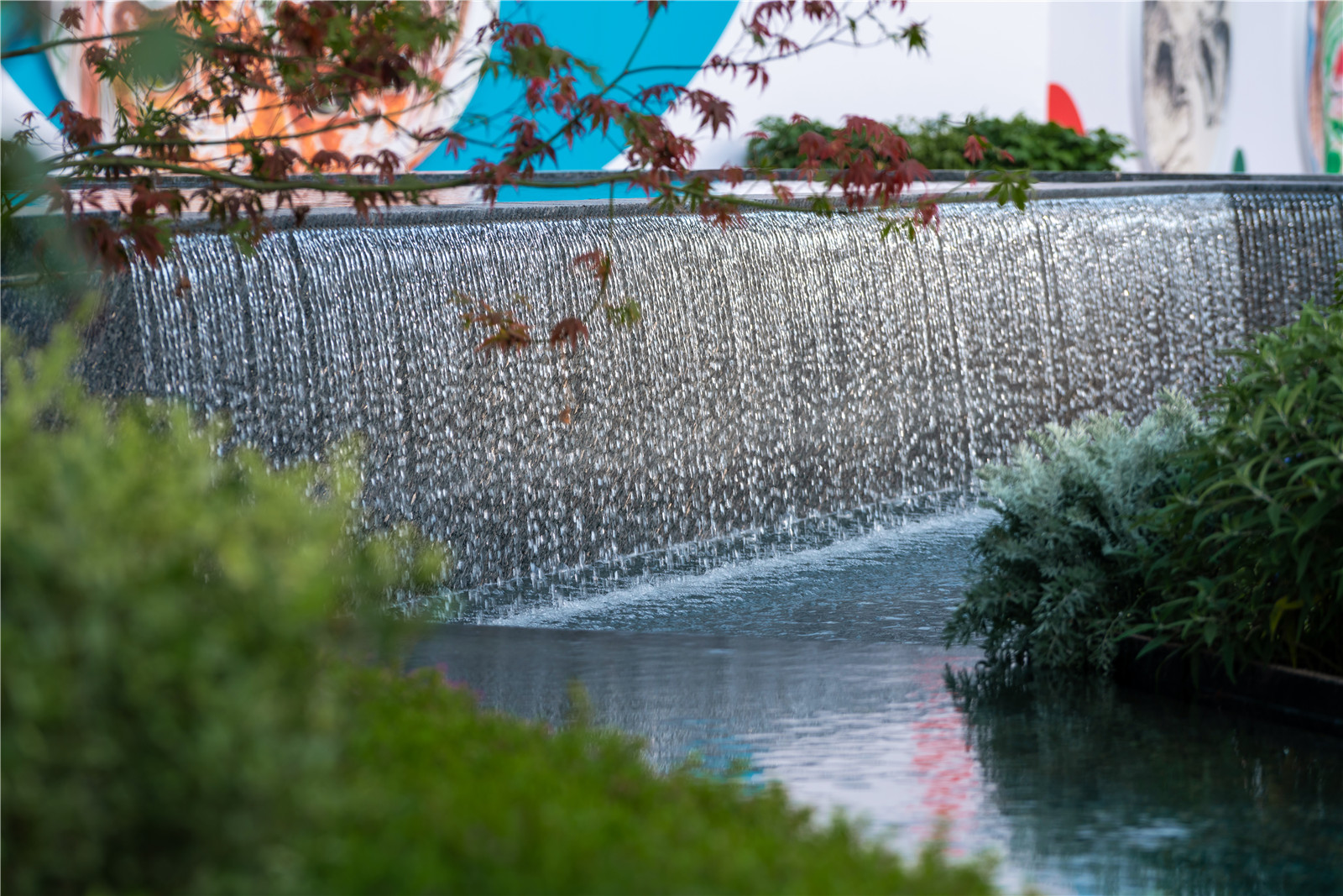 跌水潺潺,烏桕婀娜,流形于藝術(shù),麗狀于木石,在明快顏色的加持下,觀者的視覺隨著色彩的放逐而膨脹,仿若體內(nèi)的每個(gè)細(xì)胞都隨著藝術(shù)色彩的升華而躁動(dòng)、迸發(fā),“視網(wǎng)膜顫抖”下的悸動(dòng),是色彩與靈魂的共鳴。