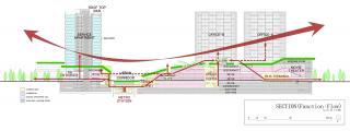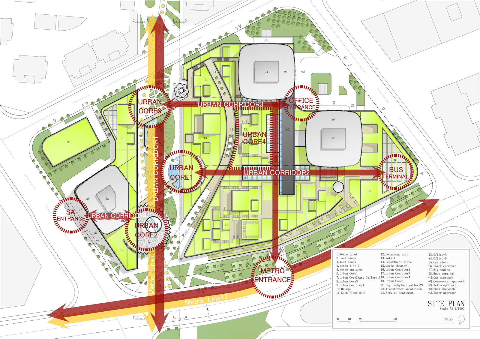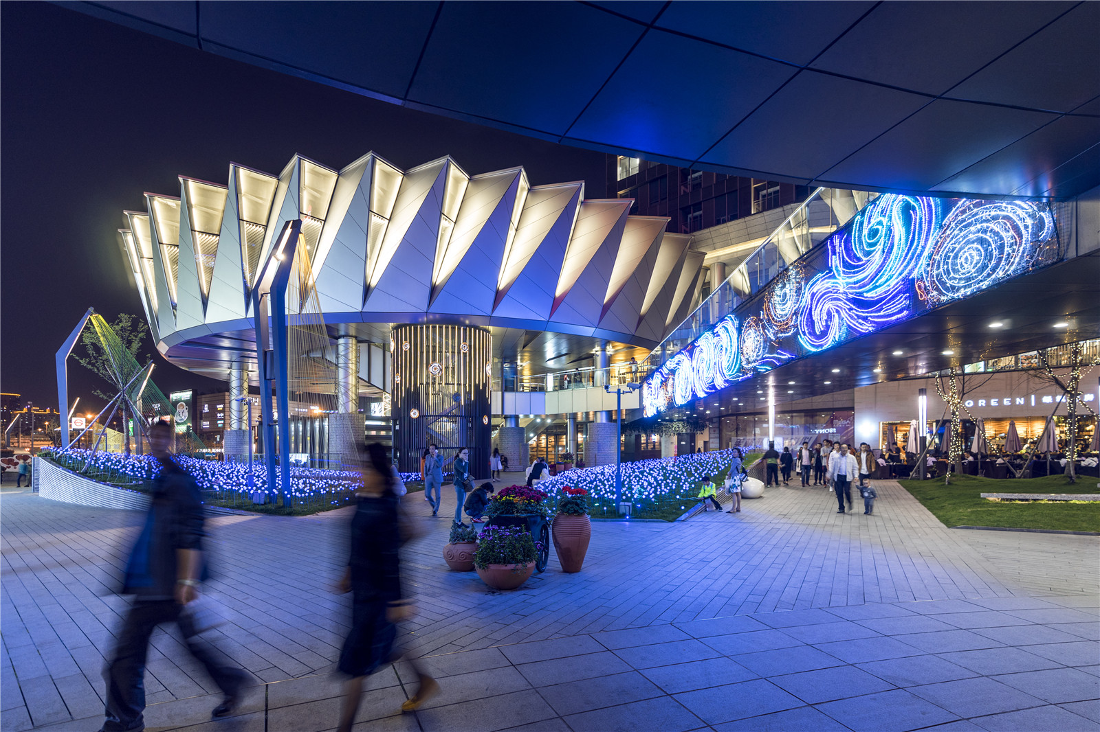 這是一個(gè)峽谷形態(tài)的建筑拓?fù)湫?,建筑面積30萬(wàn)平方米,項(xiàng)目場(chǎng)地中心設(shè)計(jì)有一條寬闊的綠道(景觀綠帶)。它座落在一個(gè)上海核心地鐵站的正上方,包裹著7號(hào)線和12號(hào)線的換乘站-龍華路站,吸引著所有每天到訪這個(gè)地鐵站的人們以及居住在項(xiàng)目周邊的市民。