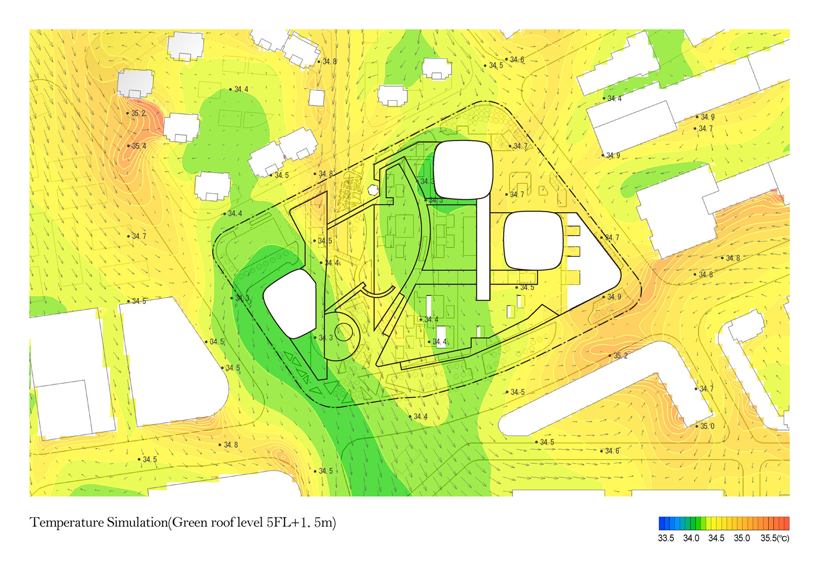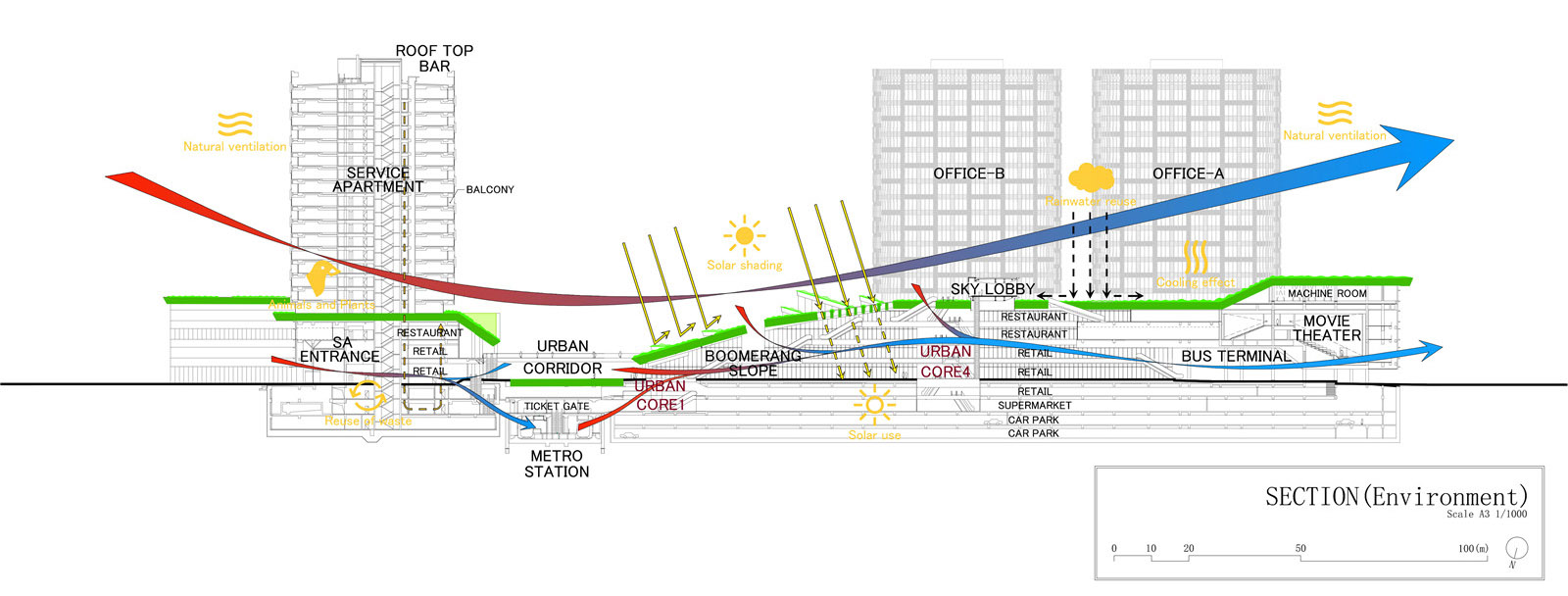項(xiàng)目充分利用了環(huán)境技術(shù),將所有的商業(yè)動(dòng)線都安排在了無(wú)需空調(diào)的半室內(nèi)半室外的灰空間內(nèi)。通過(guò)此舉,普通情況下每年需要112,000GJ的空調(diào)能耗在本項(xiàng)目中被削減為零。而且無(wú)空調(diào)的設(shè)計(jì),有效降低了本項(xiàng)目每年二氧化碳的排放量約72,200噸,這相當(dāng)于26.2公頃的森林一年能夠吸收的二氧化碳的數(shù)量。
