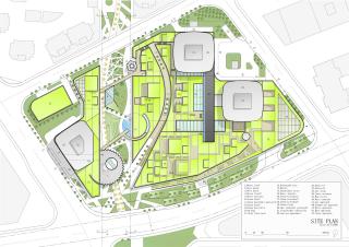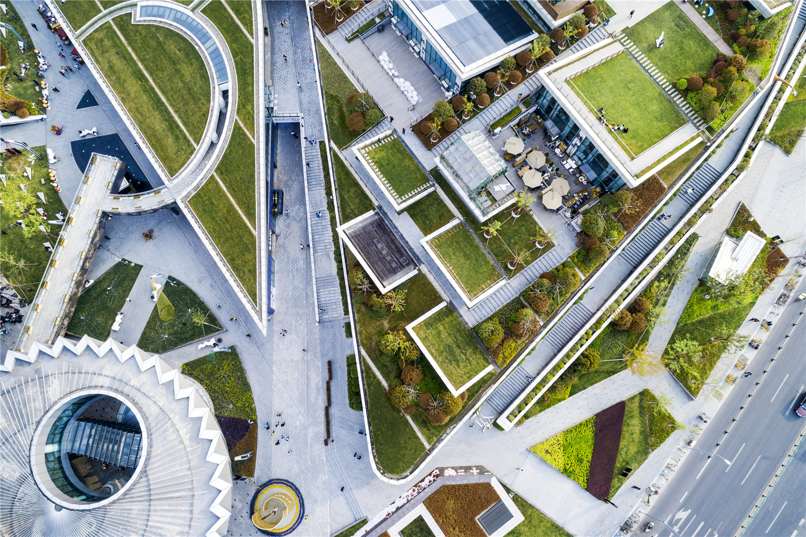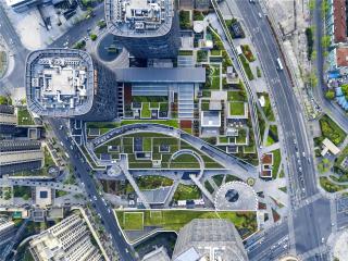 場(chǎng)地內(nèi)設(shè)計(jì)了巨大的綠化空間。在這些綠色之中,設(shè)計(jì)師以上海傳統(tǒng)建筑的“老虎窗”為靈感,在不同的建筑高度上設(shè)置了著大量的外向型小型活動(dòng)平臺(tái);并且通過(guò)將所有這些尺度適宜的活動(dòng)場(chǎng)地、 綠化屋頂、辦公入口、零售店鋪以及公共交通場(chǎng)地被緊密的編織在生動(dòng)有趣的在三維空間之中,凝聚成為了一個(gè)大尺度的,擁有充足自然光和綠色元素城市公共空間。