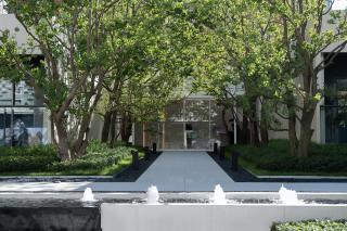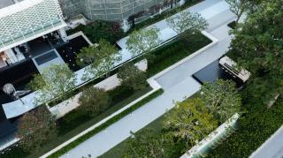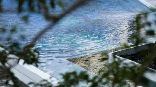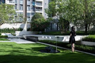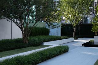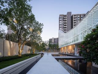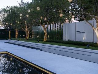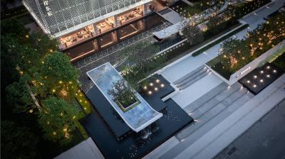 流轉(zhuǎn)的江水貫穿前場(chǎng)空間,錯(cuò)落有致的疊級(jí)水岸穿插水瀑設(shè)計(jì),使空間場(chǎng)景更加生動(dòng)豐富,讓業(yè)主在空間的行進(jìn)與潺潺的水聲中,體驗(yàn)精致的江畔生活。特色的紫薇樹(shù)陣形成樹(shù)影婆娑的林下場(chǎng)地,營(yíng)造出靜謐、悠然的閑適空間。