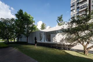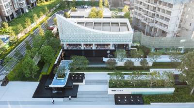 由光影斑駁的林下空間轉(zhuǎn)折而行,是另外一艘急駛的帆船,甲板的盡頭是青春洋溢的藝術(shù)雕塑,她迎風(fēng)而舞,海風(fēng)吹起長(zhǎng)發(fā),手中的蒲公英也隨風(fēng)飄舞,自由奔放的恣意形象極具感染力。澄澈的江面上霧慢慢散落下來(lái),舉目浩浩東江,來(lái)者仿佛屹立于東江潮頭。設(shè)計(jì)將建筑的尺度,江景的氣度和生活的溫度交融,當(dāng)代藝術(shù)美學(xué)與空間精神內(nèi)涵互映、理性與情懷融洽。