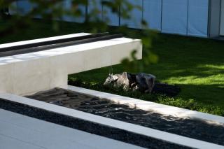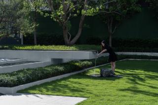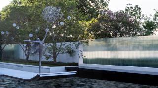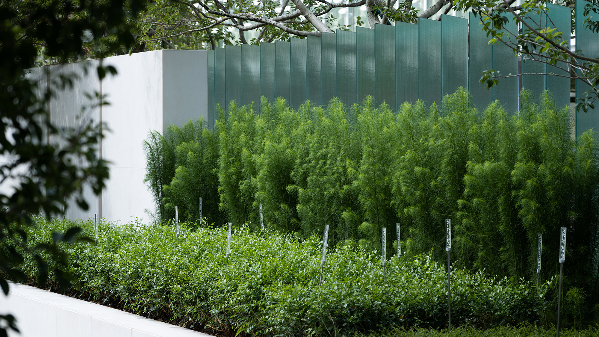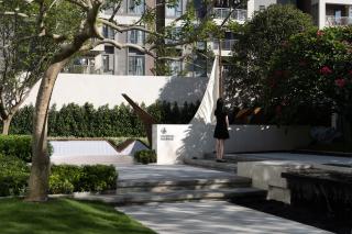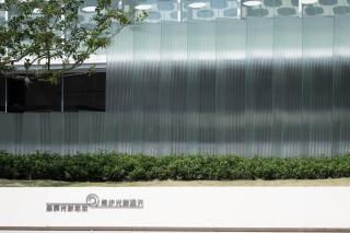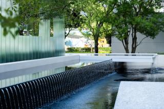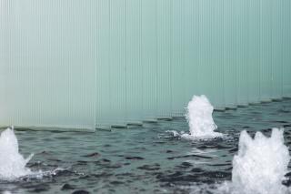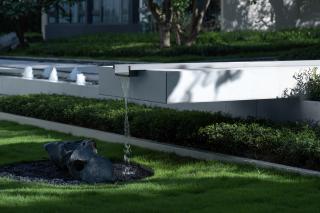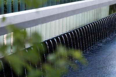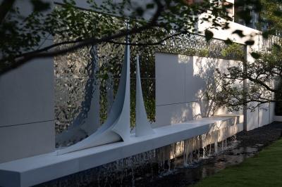 綠蔭掩映中,不銹鋼的特制墻面似風(fēng)吹開(kāi)的水面,漣漪隨之?dāng)U散,投射出波光粼粼的江景,陽(yáng)光下造型優(yōu)美的石榴樹(shù)影搖曳在墻面上,重重白帆競(jìng)渡之間,簾瀑聲聲作響,動(dòng)靜之中,整面墻猶如大自然的畫(huà)布一般,映射出綺麗的人生風(fēng)景。
