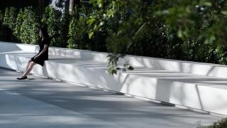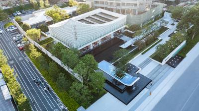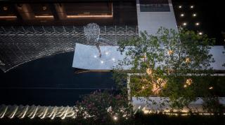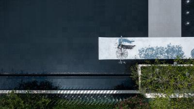 項(xiàng)目主體建筑是富有藝術(shù)感和昭示性的帆之形,簡(jiǎn)潔現(xiàn)代。景觀設(shè)計(jì)延續(xù)建筑的元素與意韻,將人文意境和現(xiàn)代藝術(shù)融合,以風(fēng)帆和江山進(jìn)行抒意。引入跌落的水瀑,以頗具質(zhì)感的石材擋墻與輕巧的玻璃格柵區(qū)分邊界,利用臺(tái)階巧妙消解場(chǎng)地高差的同時(shí),強(qiáng)化軸線景觀的序列感與儀式感。