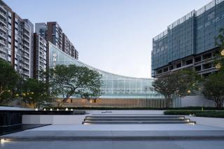 拾級(jí)而上,大尺寸的石材干練而簡(jiǎn)約,青色玻璃如山之遠(yuǎn)影,呼應(yīng)建筑的輕盈飄逸之感。重疊立體的空間關(guān)系展現(xiàn)出“東江之帆”的設(shè)計(jì)命題。開(kāi)闊大氣的入口形象, 塑造出開(kāi)放接納的精神領(lǐng)地,充滿藝術(shù)的隱喻之美。