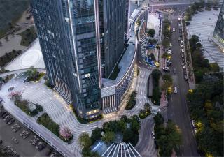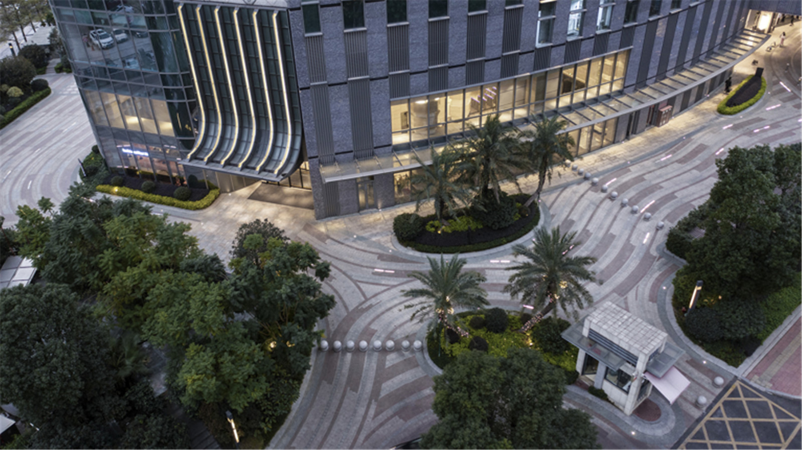 通過特色鋪裝削減大面積登高面的單調(diào),鋪裝線條與建筑立面相互映襯。內(nèi)側(cè)灌木綠化干凈,清爽,外側(cè)盡可能在不影響消防的前提下,通過喬木提升綠量。酒店式服務(wù)公寓區(qū)域,綠地率較低,景觀通過水島的種植手法,增大了綠量,而流水線條鋪裝與建筑線條的相互映襯,增加了場地的特色。