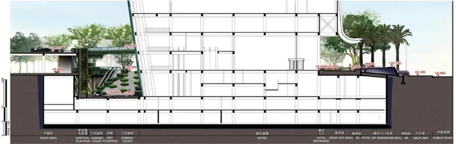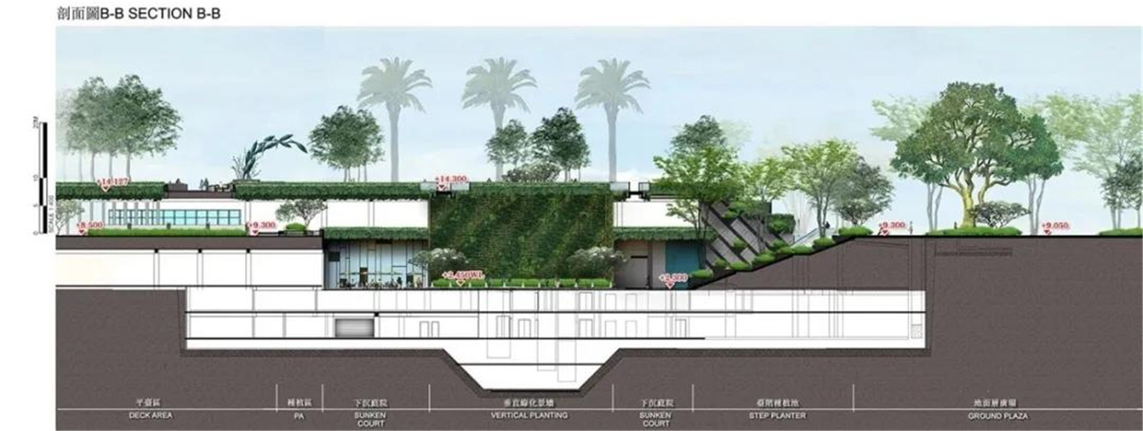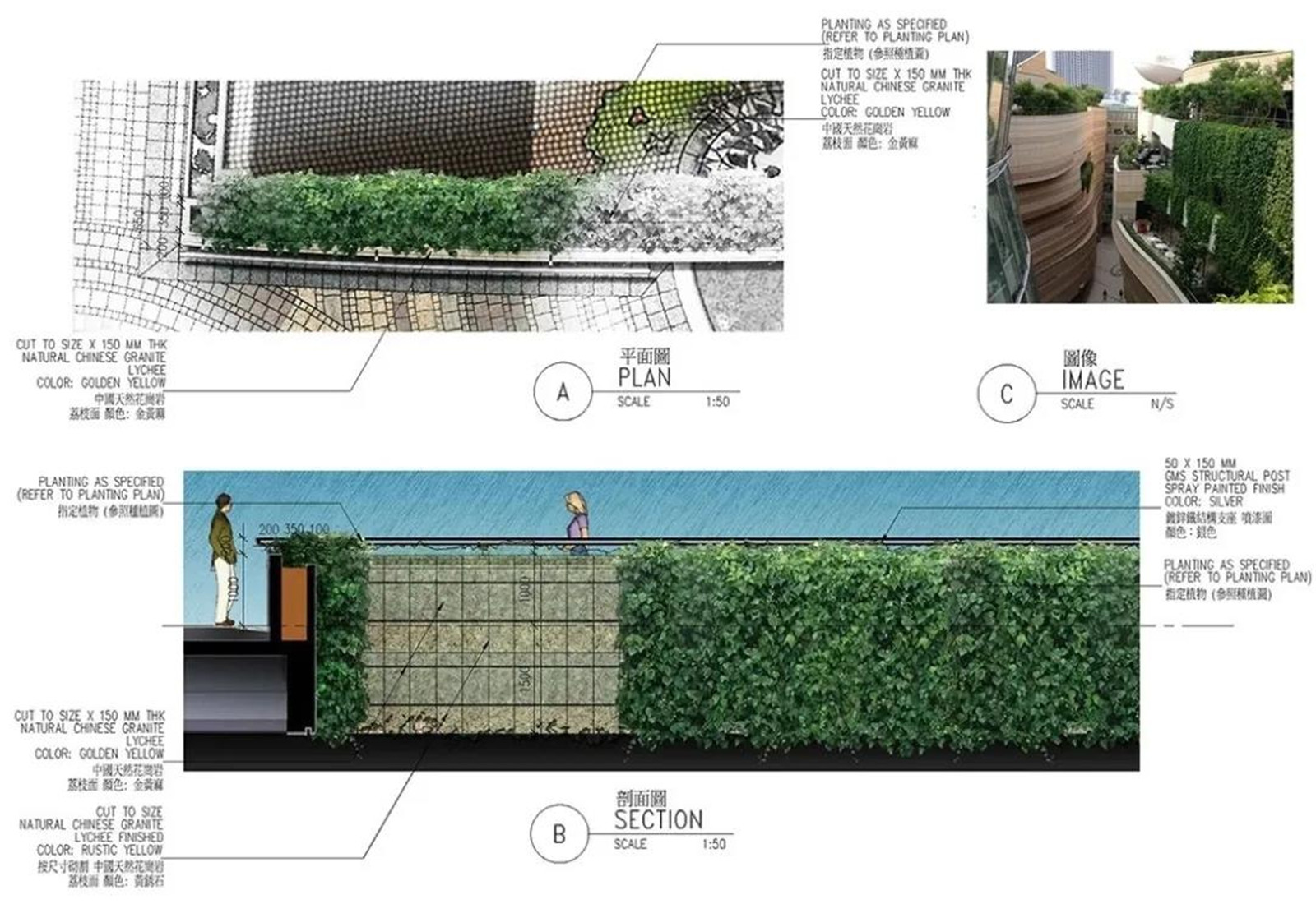 建筑邊緣增加300寬立體種植,下層借上層錯(cuò)層邊緣綠化;把綠化做到極致,精確到毫米級(jí)的細(xì)節(jié)。