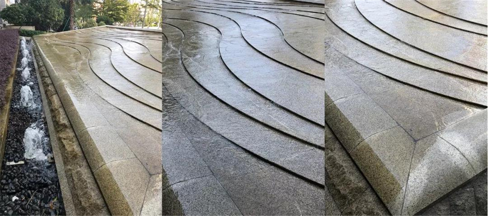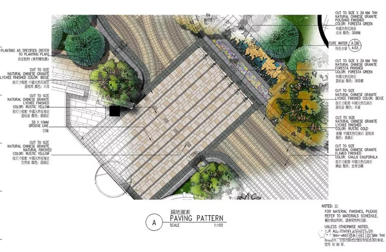 三尚完善的擴(kuò)初一體系, 為項(xiàng)目施工提供了精準(zhǔn)的圖紙配合,流水弧線鋪裝在施工中確實(shí)有不小的難度,不是幾米幾米的重復(fù)模塊化,而是整個(gè)一個(gè)區(qū)域幾十米到上百米是一個(gè)大的鋪裝模塊,在這個(gè)尺度里面來跳色形成特色鋪裝,同時(shí)商業(yè)街內(nèi)外高差1米5,酒店車道和消防車道的3向坡,委托方和施工方愿意接受挑戰(zhàn)也是這個(gè)項(xiàng)目成功實(shí)施的關(guān)鍵。