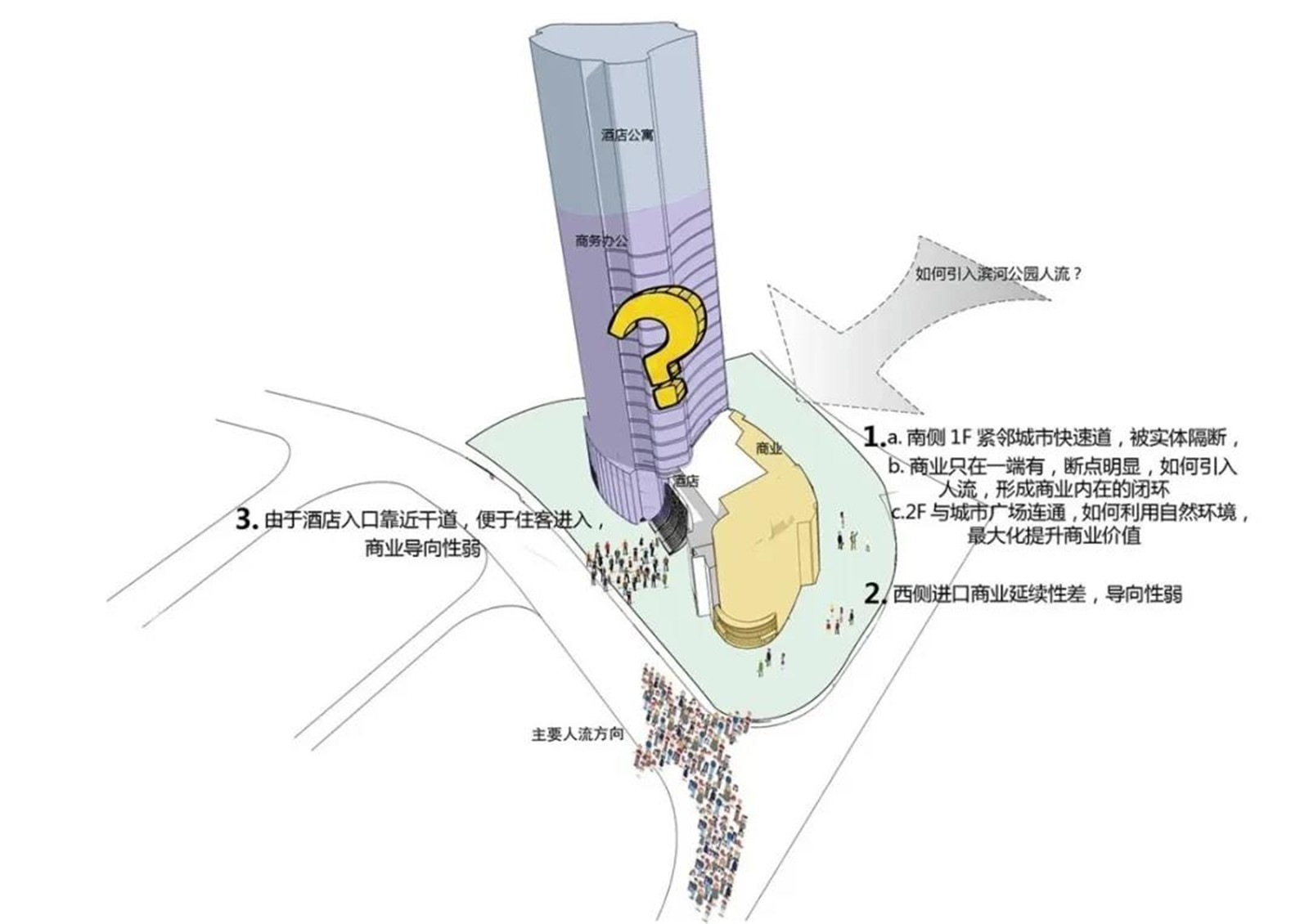 用地維度分析:1.南側(cè)1F緊鄰城市快速道,被實(shí)體隔斷,商業(yè)只在一端有,斷點(diǎn)明顯,如何引入人流,形成商業(yè)內(nèi)在的閉環(huán)?2F與城市廣場連通,如何引入濱河公園人流,最大化提升商業(yè)價(jià)值?2.西側(cè)進(jìn)口商業(yè)延續(xù)性差,導(dǎo)向性弱;3.由于酒店入口靠近干道,便于住客進(jìn)入, 商業(yè)導(dǎo)向性弱。