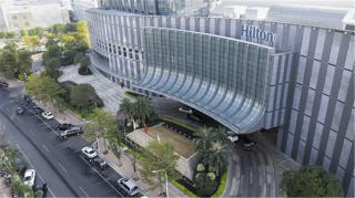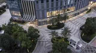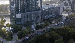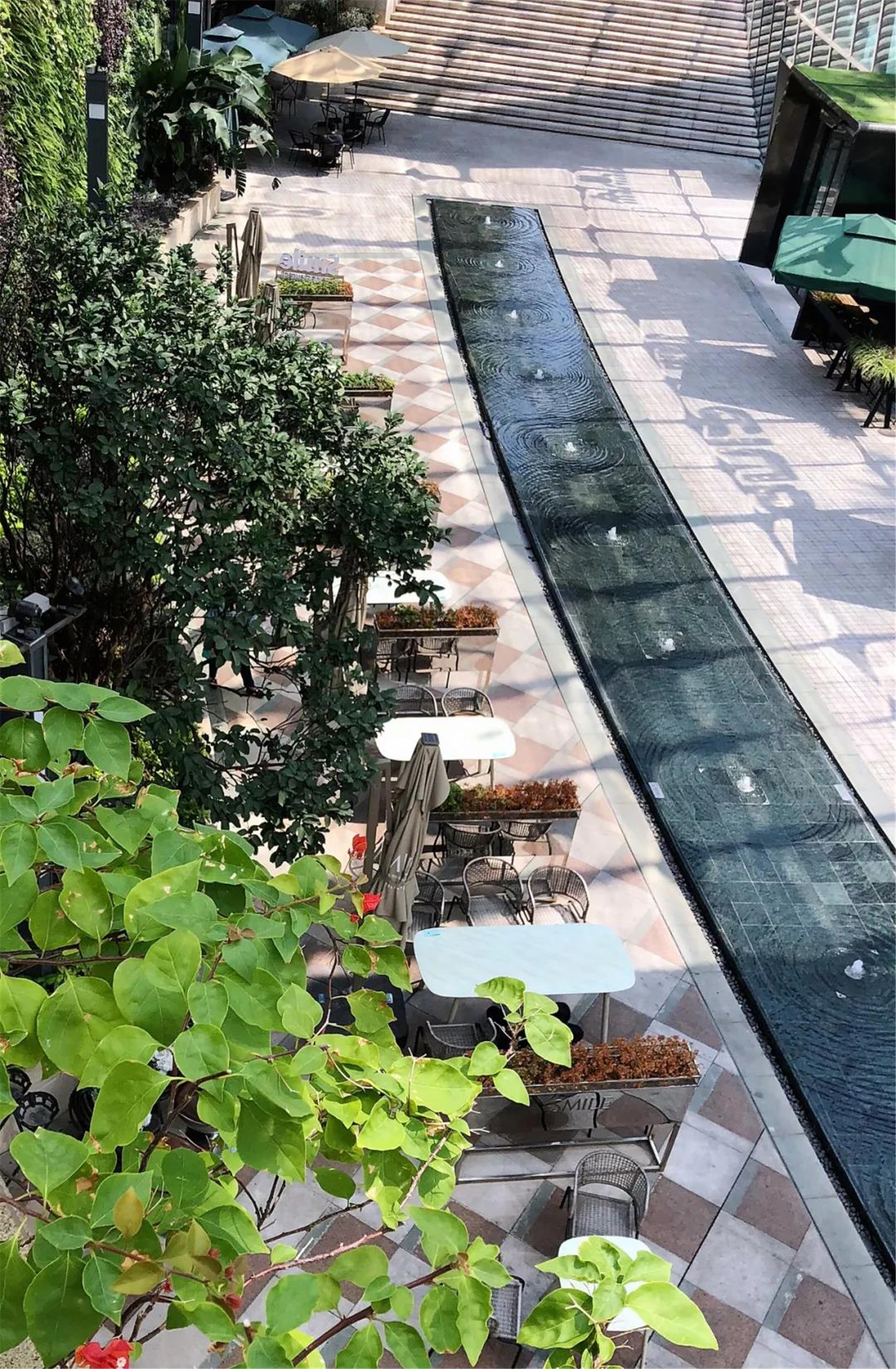 酒店區(qū)域內(nèi)外高差1米2的細(xì)節(jié)處理手法,酒店落客區(qū)的水景外高內(nèi)低,讓住客落車時(shí),視線完全看不到城市道路上的喧囂車流,只聞潺潺流水。