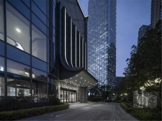 外高的水景墻,恰恰形成了面對(duì)城市大氣的酒店入口標(biāo)牌。酒店落客區(qū)的水景外高內(nèi)低,讓住客落車時(shí),視線完全看不到城市道路上的喧囂車流,只聞潺潺流水。