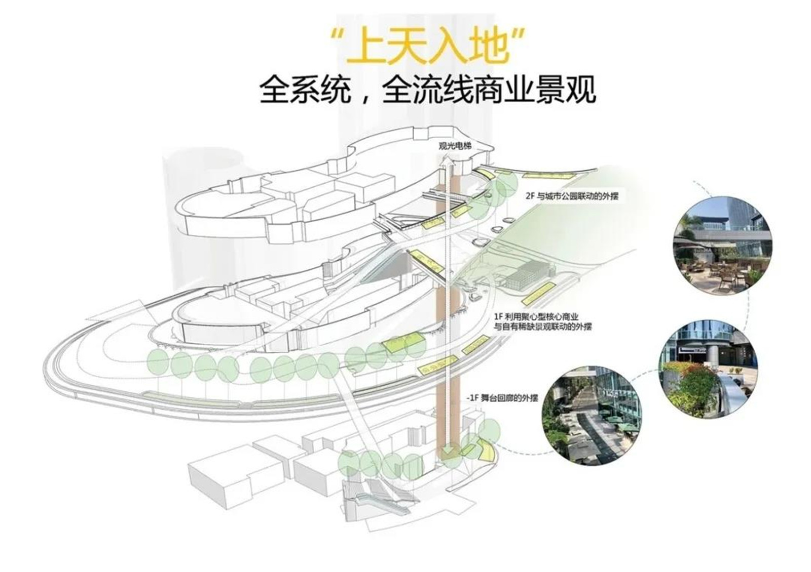景觀亮點(diǎn)分析:“上天入地”全系統(tǒng),全流線商業(yè)景觀;2F商鋪與城市公園聯(lián)動(dòng)的外擺;1F利用聚心型商業(yè)內(nèi)核,與自有稀缺景觀聯(lián)動(dòng)的外擺;聚心型商業(yè)內(nèi)核形成的-1F舞臺(tái)回廊,合院式沿水舞臺(tái)回廊的外擺。