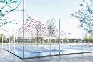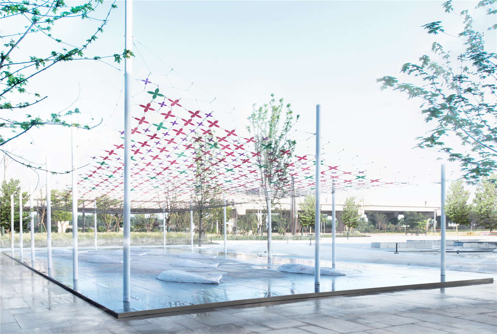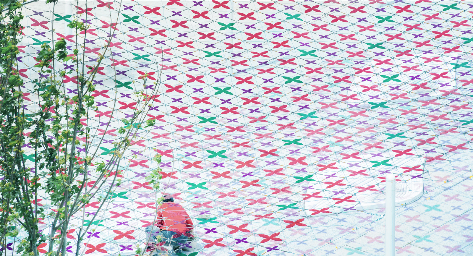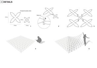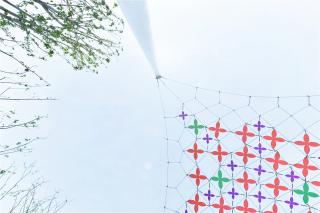 Our strategy is, to use sun light as the media, and combine a colorful transparent knitting mesh as a filter above the sky, to cast a vibrant net of light and shadow in the place. We use butterfly as our inspiration for the pattern, and play with transparency and color of the mesh, to strengthen the power of light. In this way the sunlight passing through the mesh will cast hundreds of colorful butterfly shadows in the space, to create a fantasy of ephemeral nature in space.