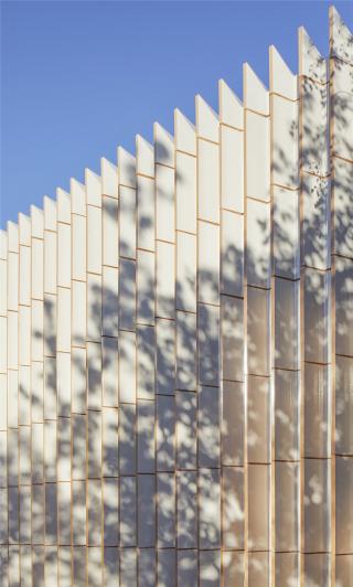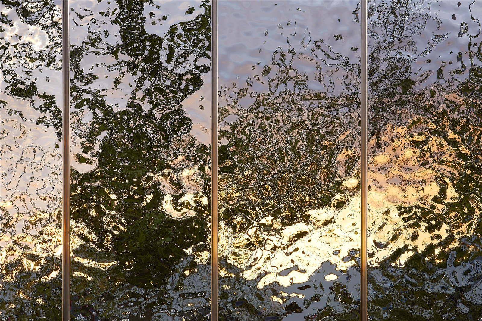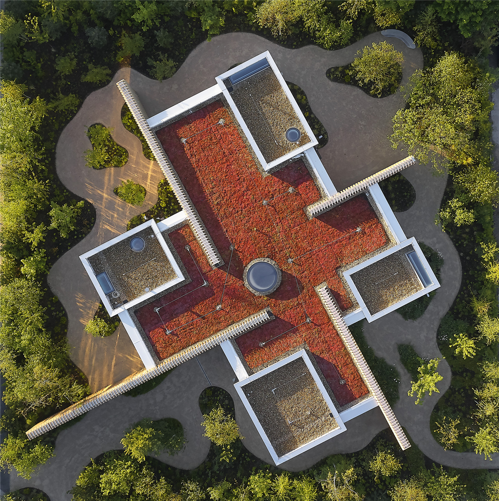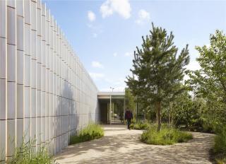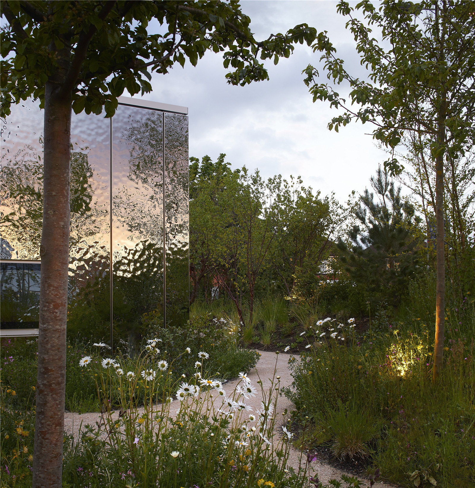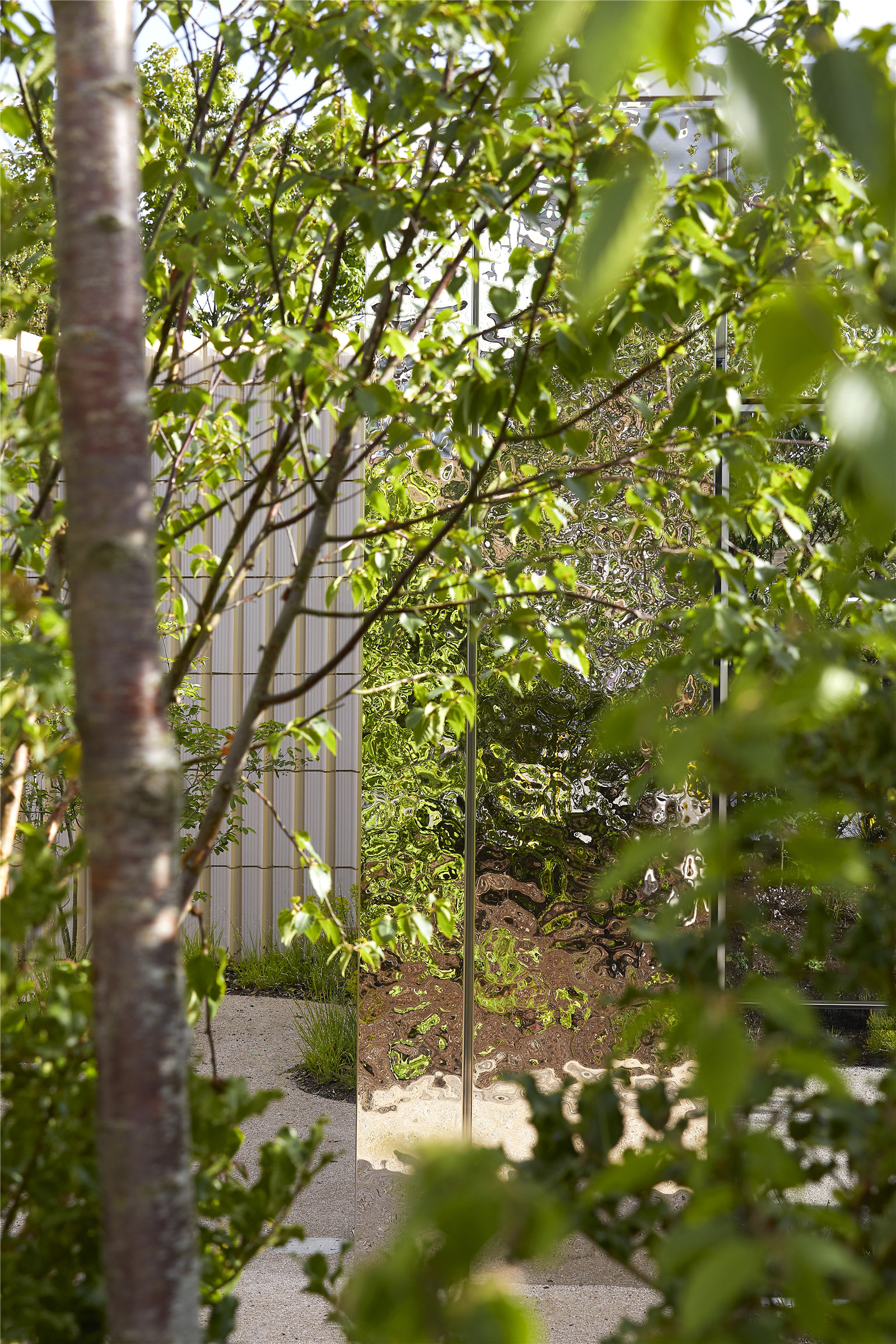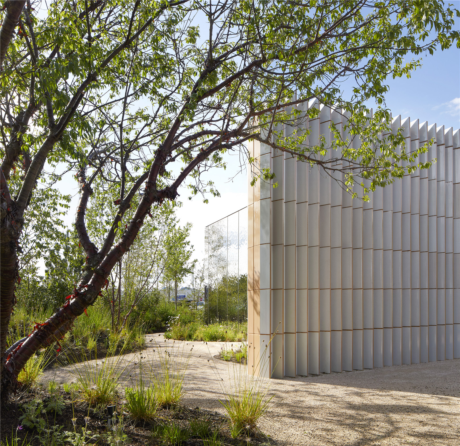 The building’s skeleton, which extends outside of the building enclosure, is formed by the four blade walls made from ceramics. The earthiness of the clay colour roots the centre to the ground. The four corners are clad in a mottled stainless steel giving a dreamy reflection of the surrounding landscape, placing the garden front and centre. The structure itself seems to disappear as it reflects the surrounding trees and planting.