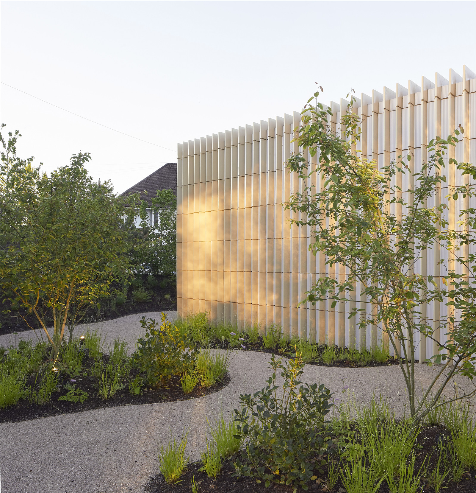 The building emerges from this naturalistic landscape with an almost ethereal clarity. The gardens are cut through by four walls that radiate from a large central space, defining more discrete spaces in each of the four corners. As in all Maggie's centres, the kitchen table sits at the heart of the building; a skylight above brings daylight and sky views deep into the building. The private areas, including consulting rooms and quiet spaces, open onto the gardens through full-height glazed sliding doors which disappear into pockets in the walls, removing the boundaries between landscape and building.