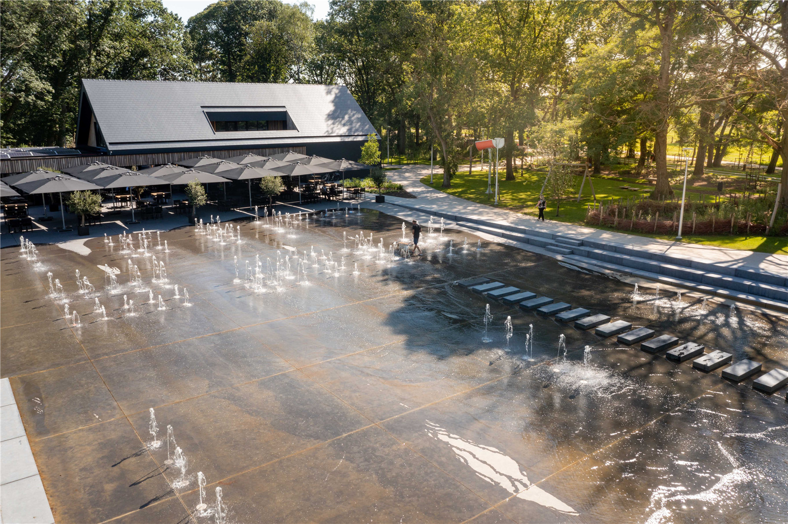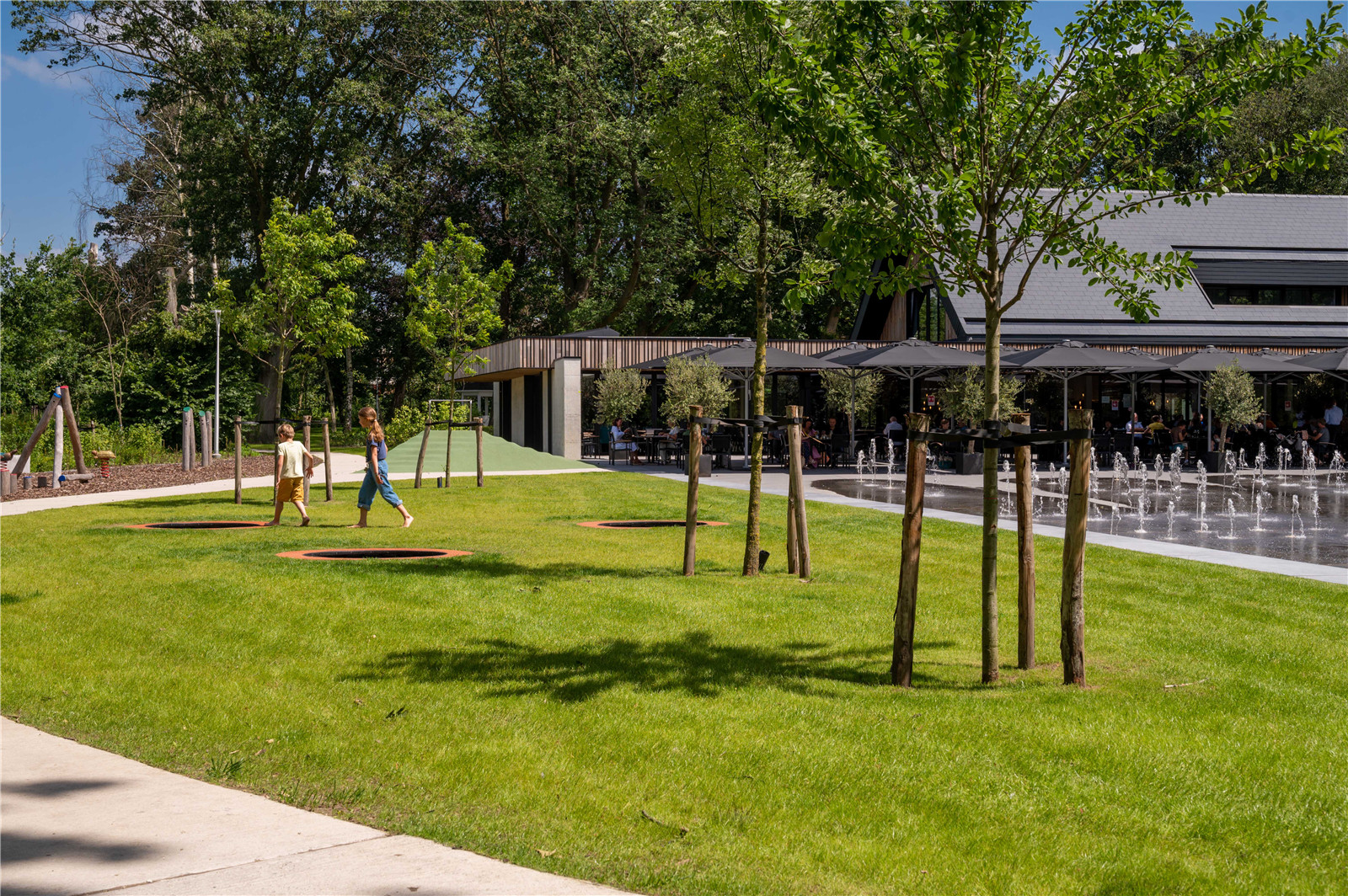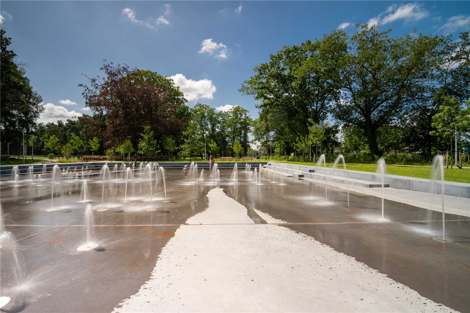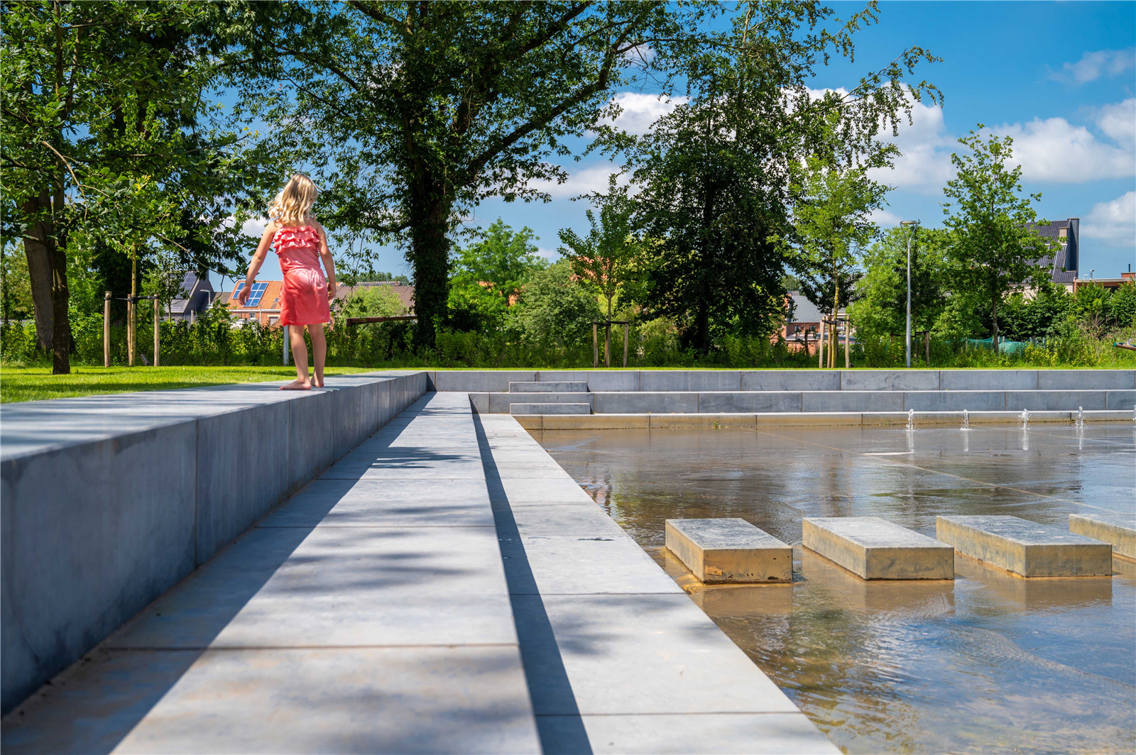 The former recreation area was transformed into a natural park in which the former swimming pool was given a new lease of life. By retaining the configuration of the swimming pool, but adapting the filling with long seating areas, a water play element and a fountain maze, the place has once again been given a central role in the park. A new pavilion with catering facilities, the water element near the terrace, inviting park paths and various play elements increase the attractiveness of the park and ensure that the park plays an important role in Stekene's public space.