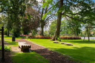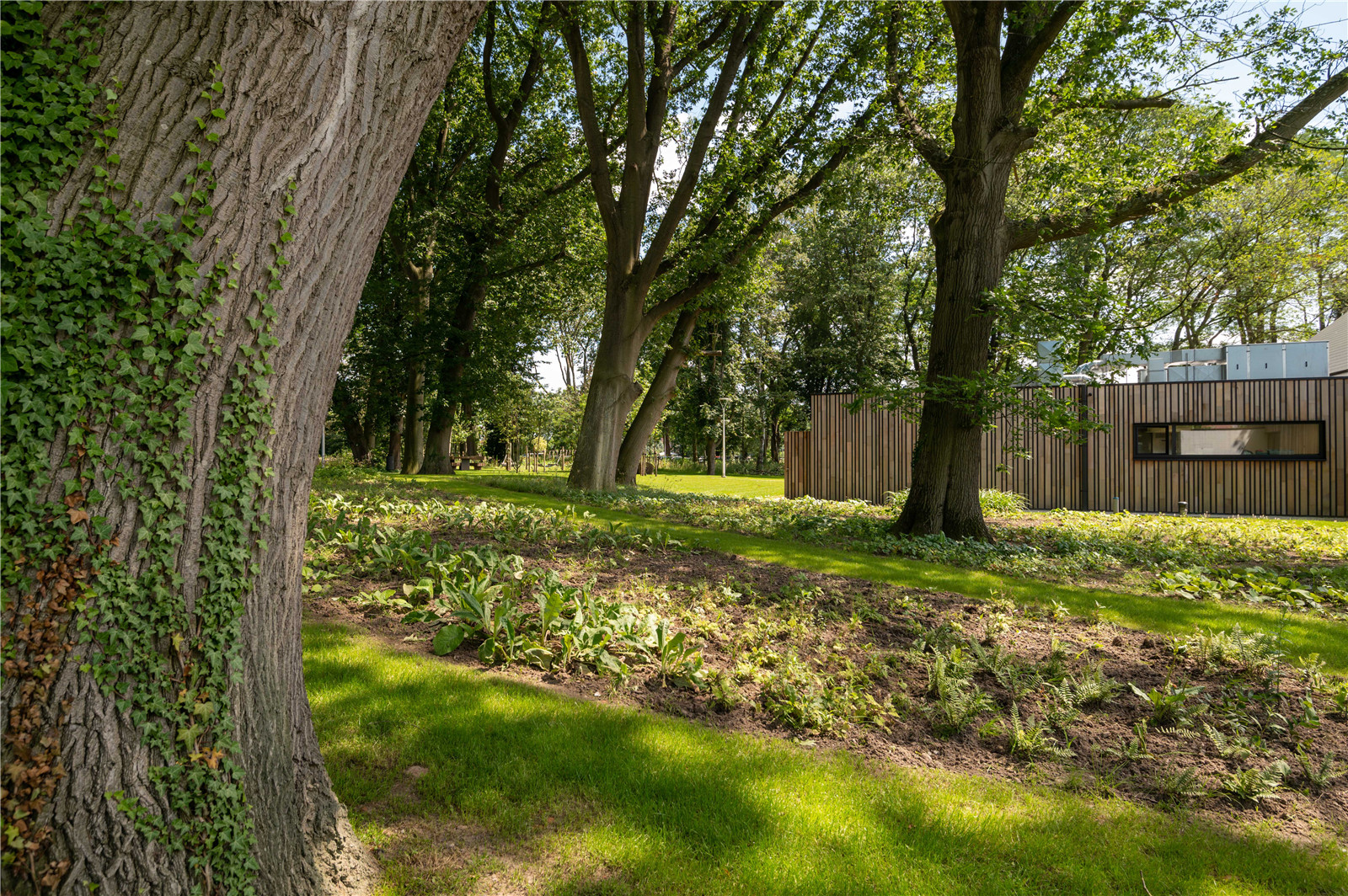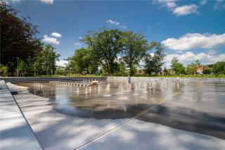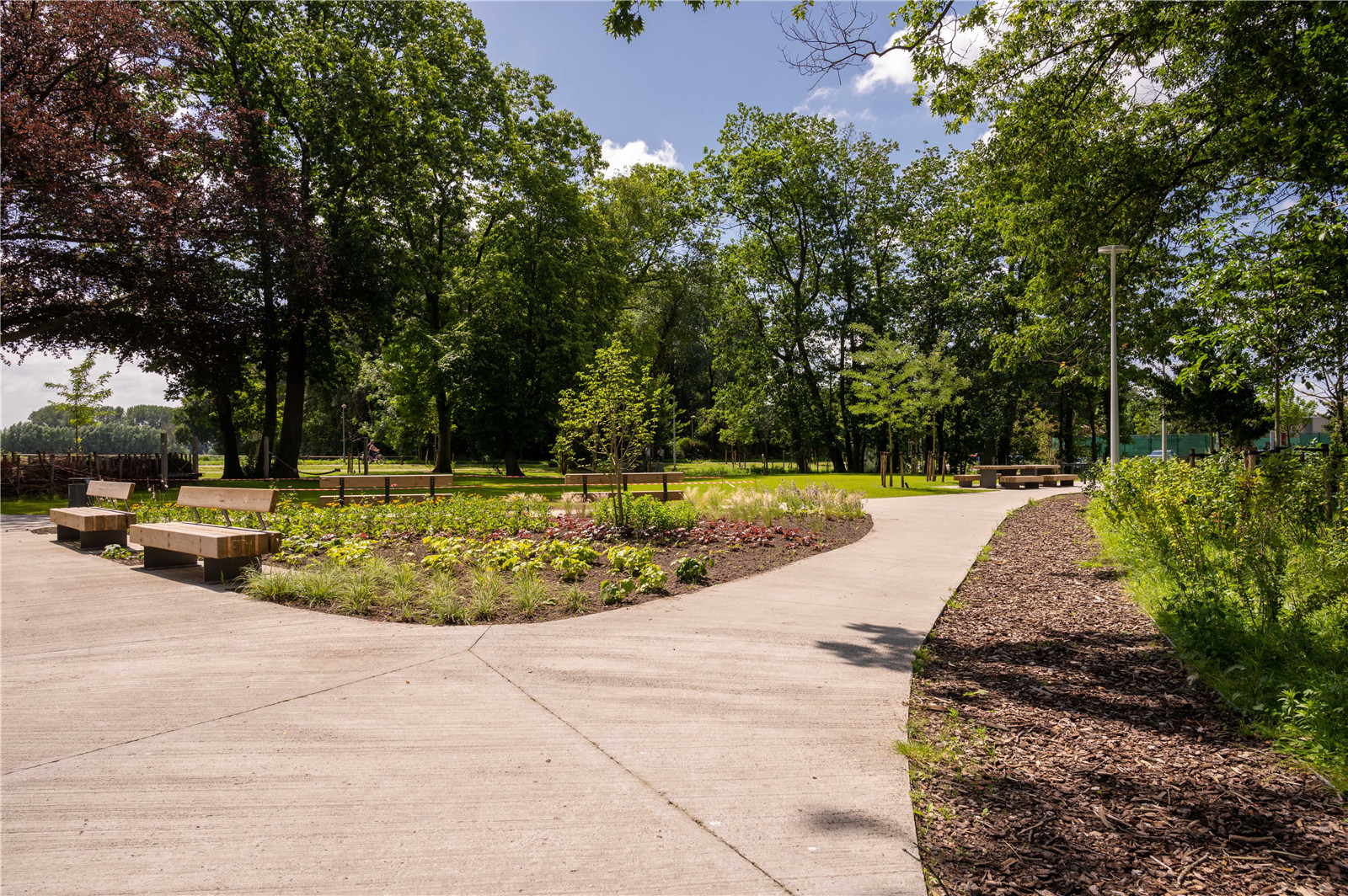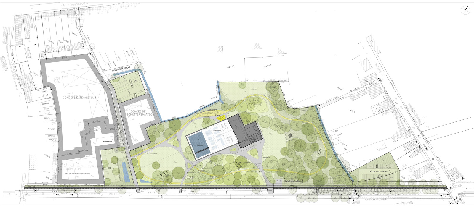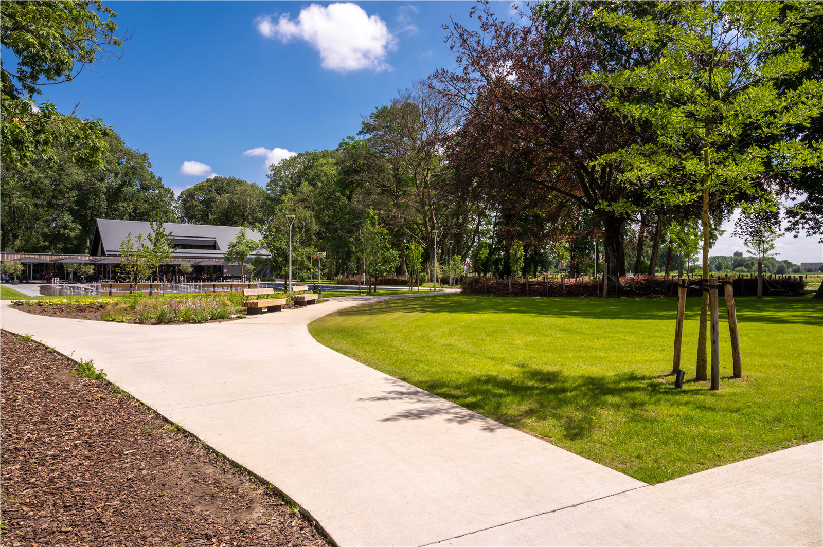 The former recreation area was transformed into a natural park in which the former swimming pool was given a new lease of life. By retaining the configuration of the swimming pool, but adapting the filling with long seating areas, a water play element and a fountain maze, the place has once again been given a central role in the park. A new pavilion with catering facilities, the water element near the terrace, inviting park paths and various play elements increase the attractiveness of the park and ensure that the park plays an important role in Stekene's public space.