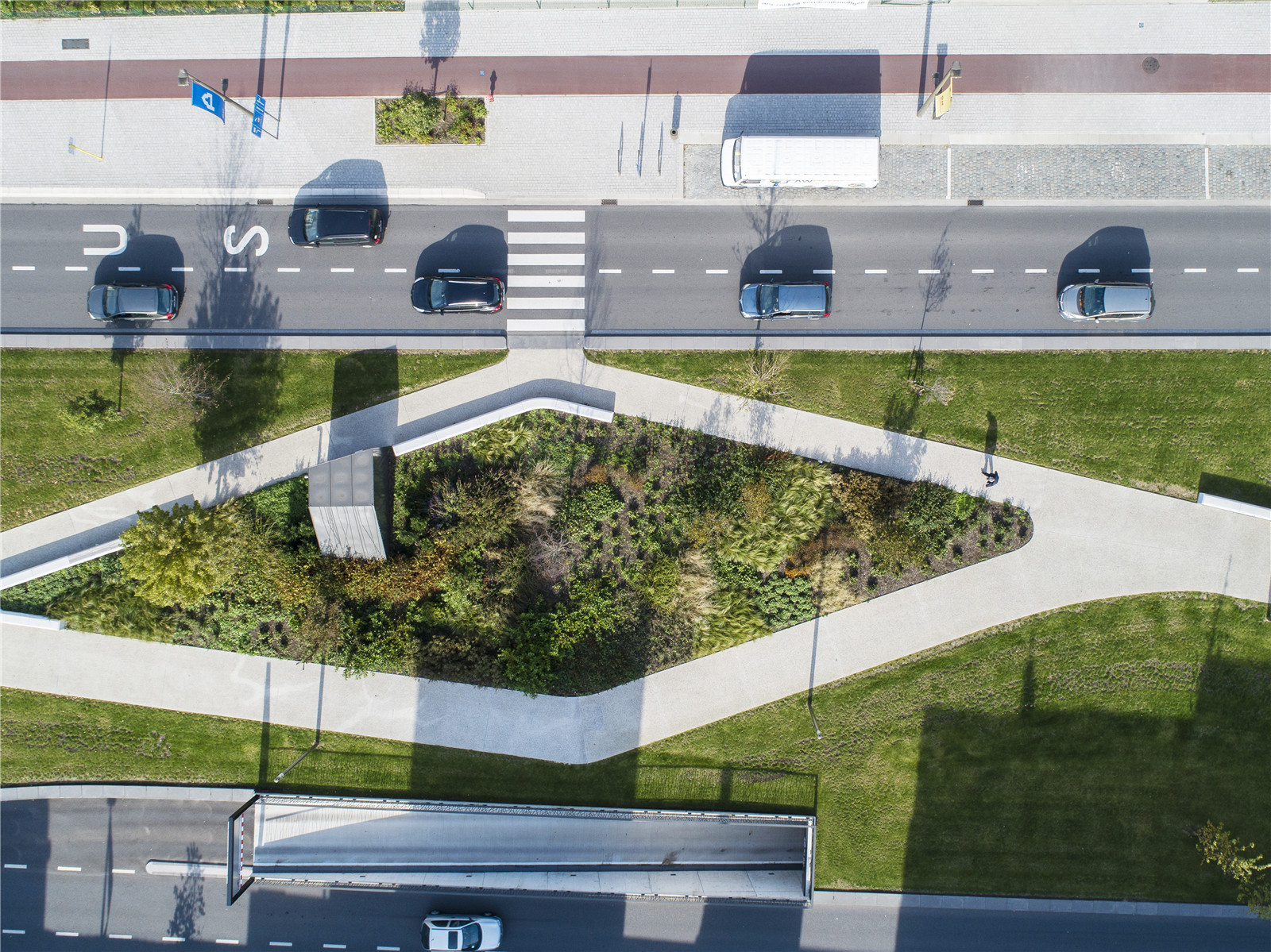 ▼種植區(qū)域和座椅強化了道路的邊界