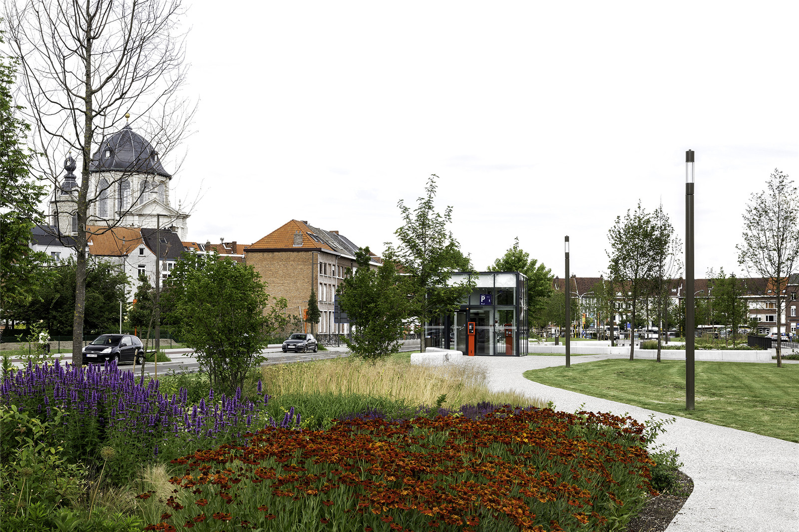 隨著能容納352輛汽車的布魯爾商業(yè)街地下公共停車場建成,Hendrik Speecqvest公園的重建工程更快地提上了日程。公園約有一半面積位于地下停車場上方,但設(shè)計妥善處理了斜坡和高差,地下停車場的結(jié)構(gòu)設(shè)計也能夠支撐大型喬木的種植,從而借助蒼翠的綠植遮蓋地下結(jié)構(gòu)。