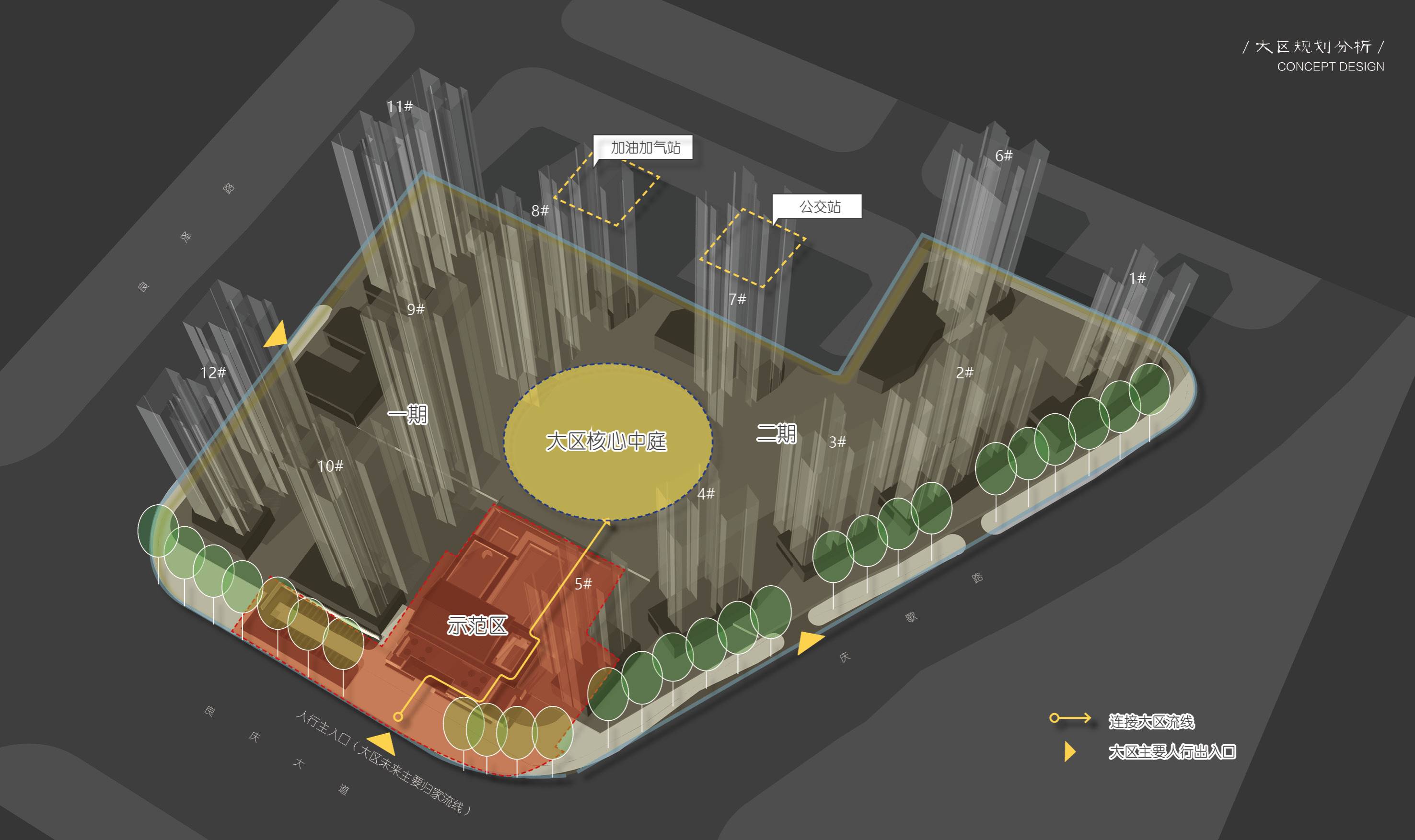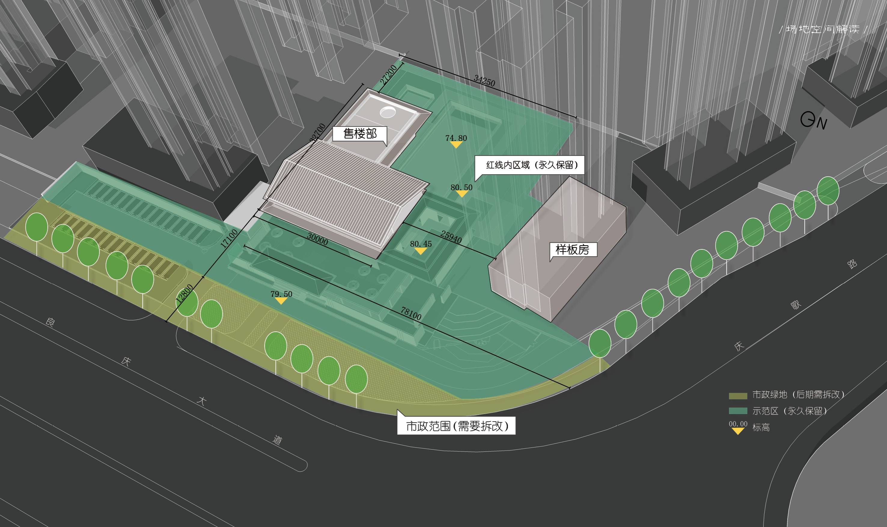 項(xiàng)目基地位置位于南寧五象區(qū),建筑整體采用“前庭后院”式布局,“前庭”場(chǎng)地整體較為平整,“后院”較前場(chǎng)下沉近六米。除市政道路外,整個(gè)展示區(qū)將永久保留,留作大區(qū)景觀的一部分。