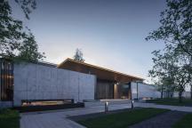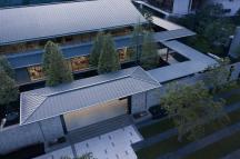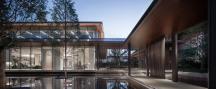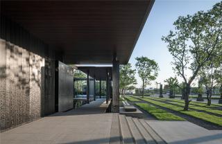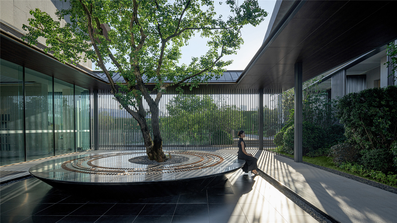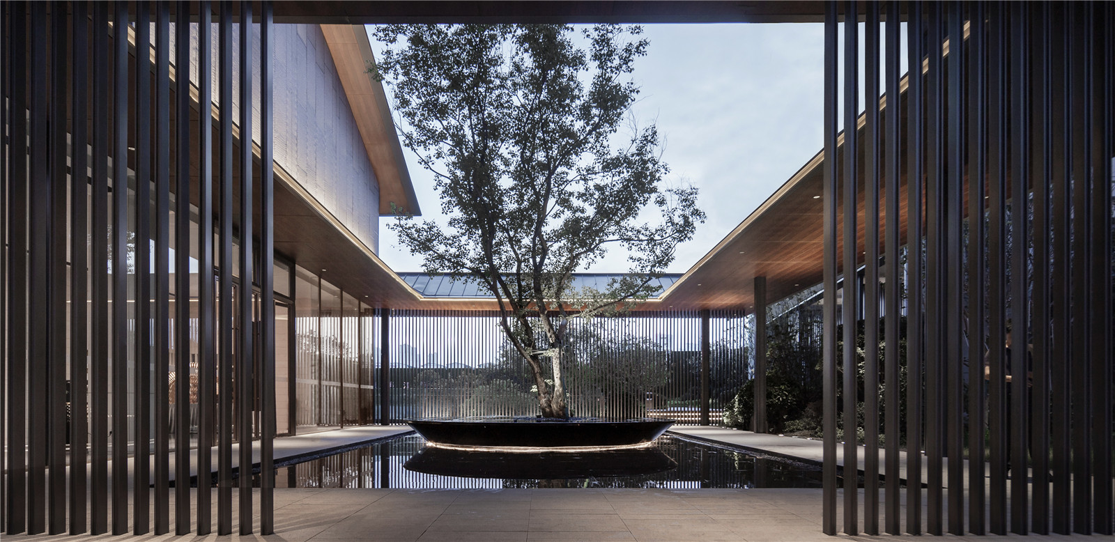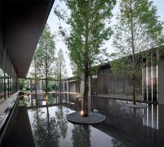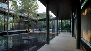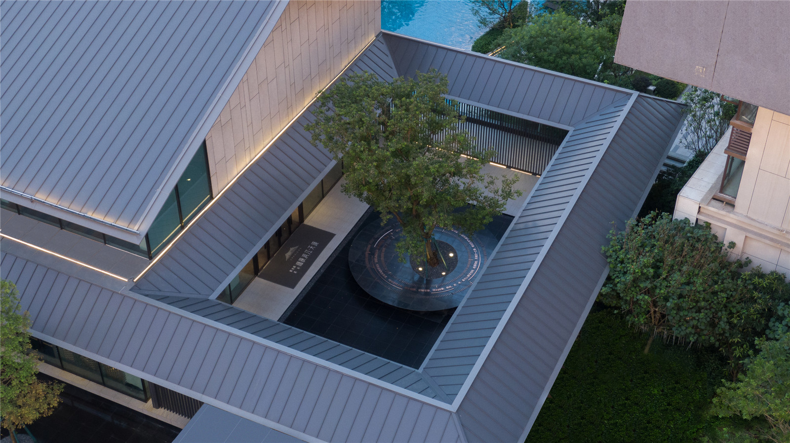 高低錯(cuò)落的連廊讓空間變得豐富起來(lái),引導(dǎo)通往一處?kù)o謐的所在。天井式的圍合空間取意“水聚天心,四水歸堂”,場(chǎng)地的豎向抬高,讓此處與外界劃分,形成獨(dú)立的個(gè)體。