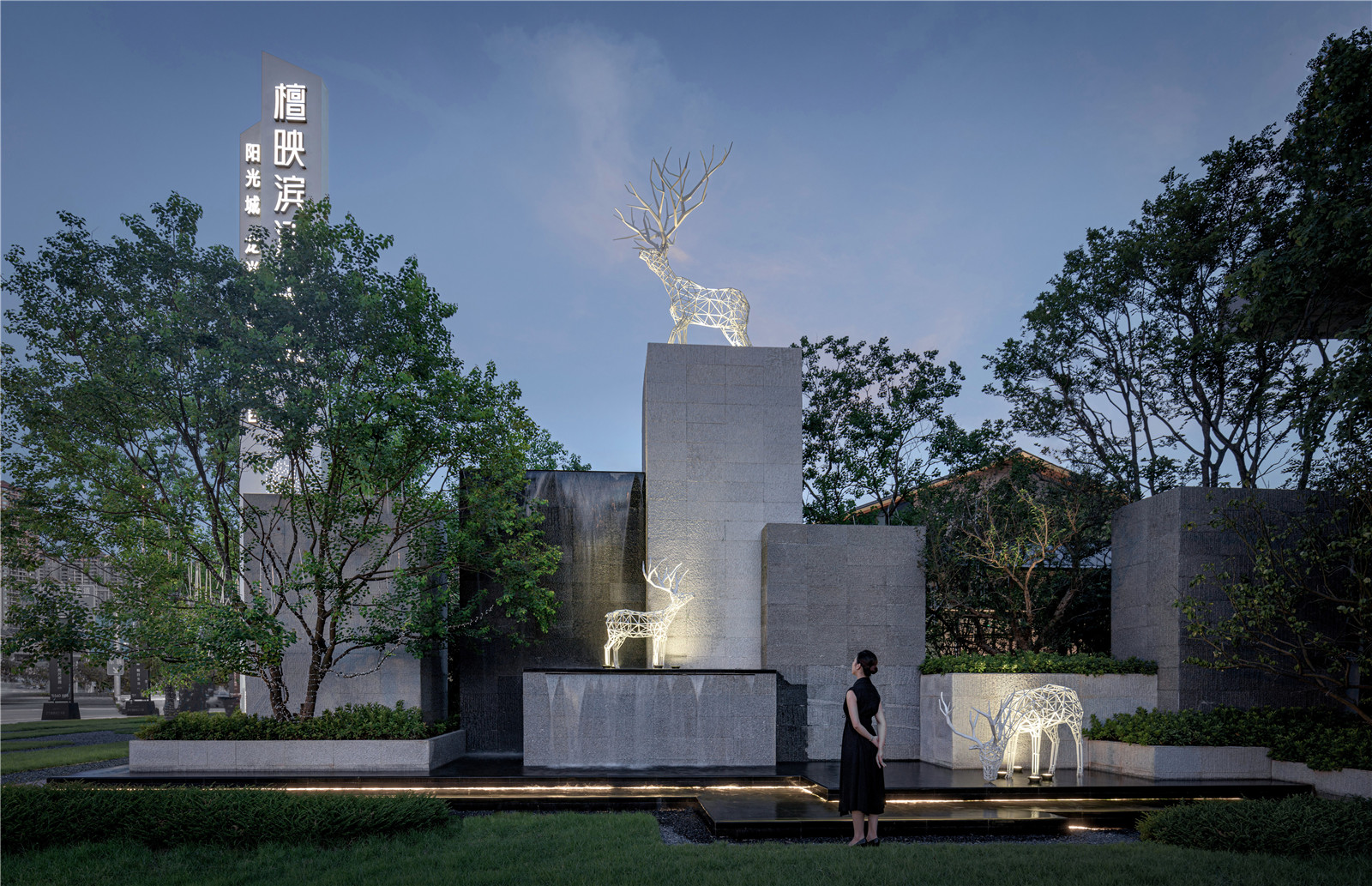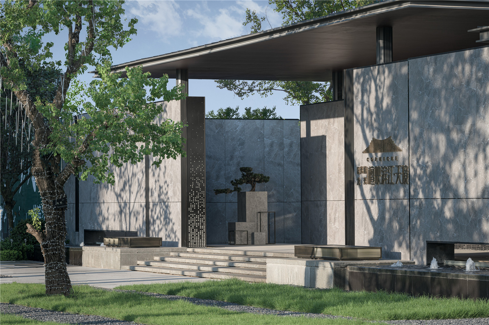 作為展示區(qū)標(biāo)識(shí)性門(mén)樓,在設(shè)計(jì)上采用干凈簡(jiǎn)潔的石材作為整體格調(diào),在細(xì)節(jié)處點(diǎn)綴金屬屏風(fēng),勾勒奢華中的低調(diào)沉穩(wěn),在綿長(zhǎng)的線條中彰顯高門(mén)闊府。