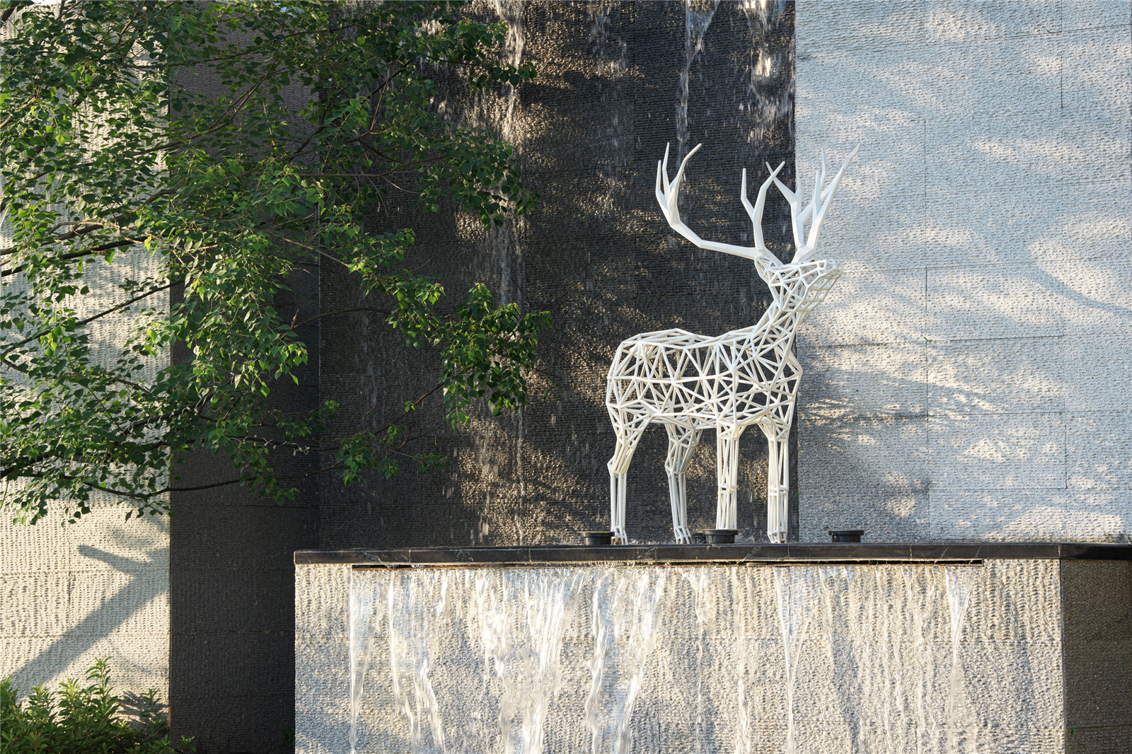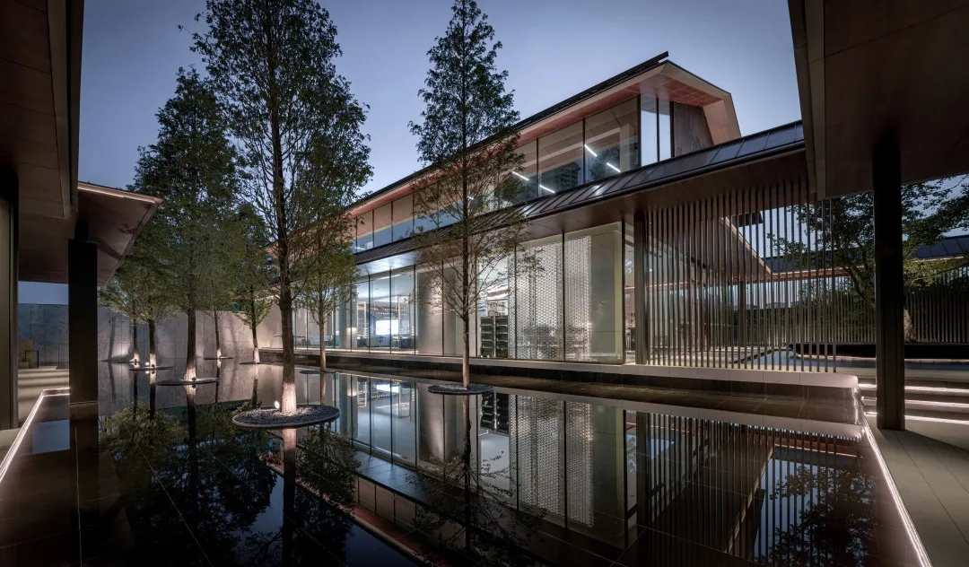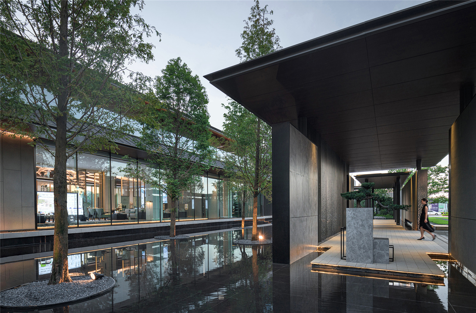 水杉林陣列布局,不同時(shí)間段陽(yáng)光通過(guò)水杉投射下來(lái)形成不拘一格的動(dòng)態(tài)光影效果,倒影重重疊疊映入靜謐水院之畔,木因水而秀,水因木而雅, 穿梭于廊亭之下,安靜的環(huán)境讓人沉醉之余,與城市喧鬧的強(qiáng)烈反差給予震撼人心的力量。