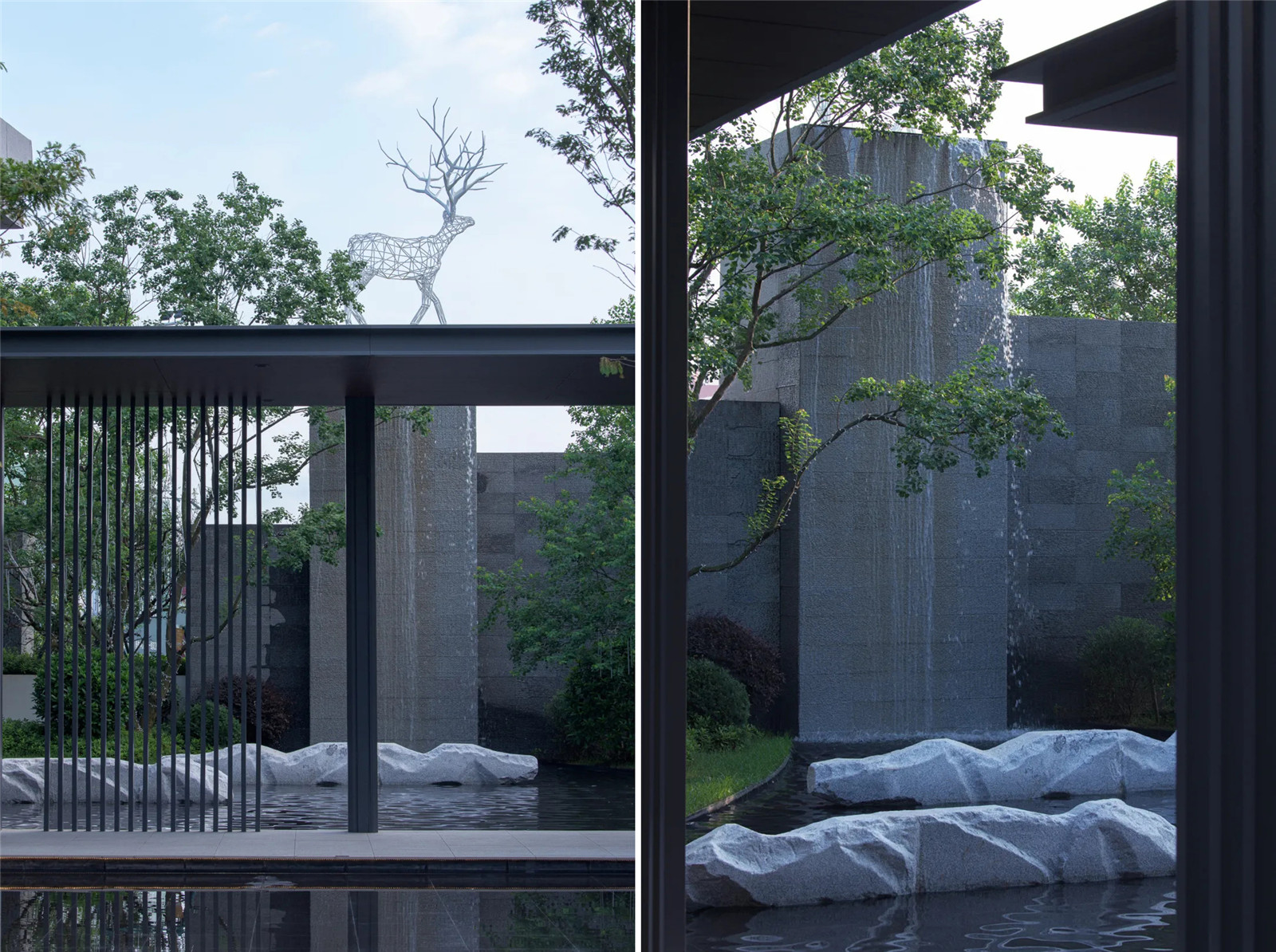“涉水其里,壺中山水,林深見(jiàn)鹿,咫尺之境,卻是千里江山”。側(cè)院雖與轉(zhuǎn)角空間共用一處組合體塊,卻是截然不同的山水境界,賒一抹山色,借一簾水聲,側(cè)院場(chǎng)地雖局促,但設(shè)計(jì)以小見(jiàn)大,山澗溪流淙淙而下,叩擊水面,余韻徐歇,芥子須彌,營(yíng)造微縮山澗一景。