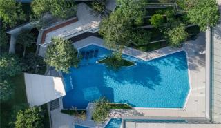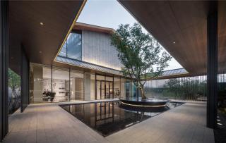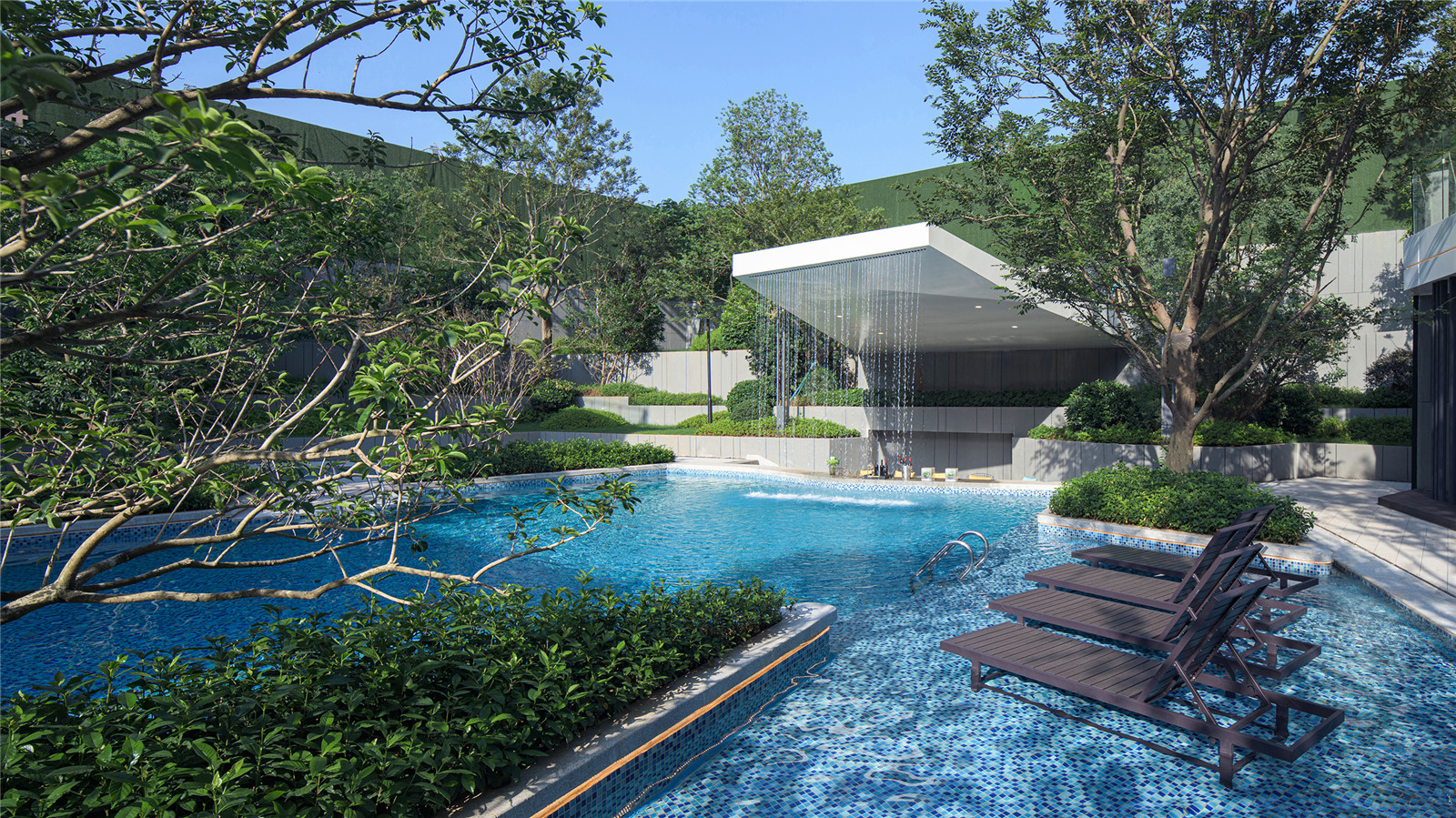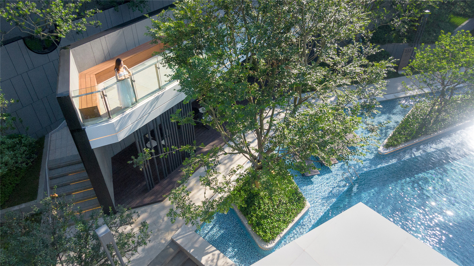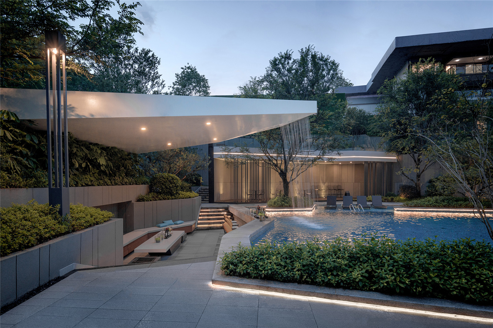 依托整體的場(chǎng)地高差,后場(chǎng)沉下了一座園子,浮起了一方廊亭,設(shè)計(jì)運(yùn)用漂浮的概念,以現(xiàn)代的折線條相互附和,使得泳池和構(gòu)筑形成一個(gè)附有層級(jí)的整體。