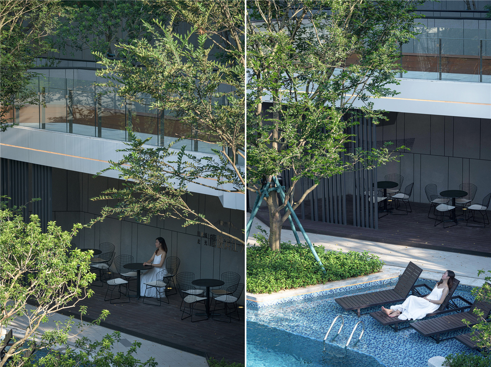 在沉園中,更多是對(duì)未來(lái)生活的一種向往,碧水,藍(lán)天,山林,斜坐,當(dāng)這些意向與現(xiàn)代生活方式融合,是人們追求品質(zhì)生活最直白的表達(dá)。